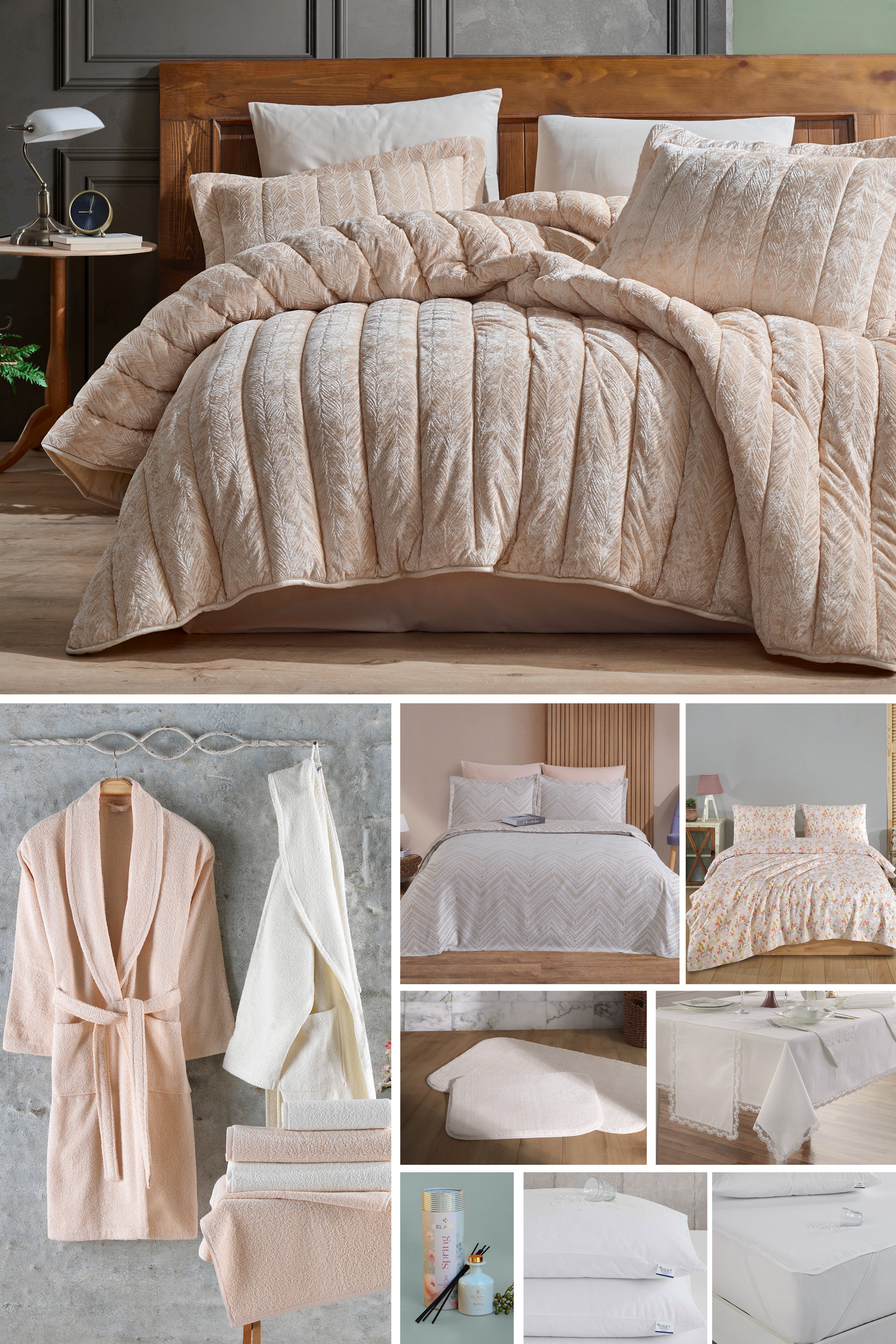 Tüm parçalar ile kapsayıcı ve tüm ev tekstili hazırlayacak dolulukta bir pakettir. Yatak örtüsü Kadife Comfort Set zamansız tasarım ürünüdür. Ürün kendi özel kutusu ve ambalajı ile gönderilir. Yatak örtüsünde ipeksi dokunuş hissi veren yumuşak kumaş kullanılmıştır. Paketin tüm parçaları evinizin günlük kullanıma uygun şekilde şık parçalardan oluşur. Günlük pamuk kumaştan oluşan tamamında %100 organik pamuk kullanılmıştır.