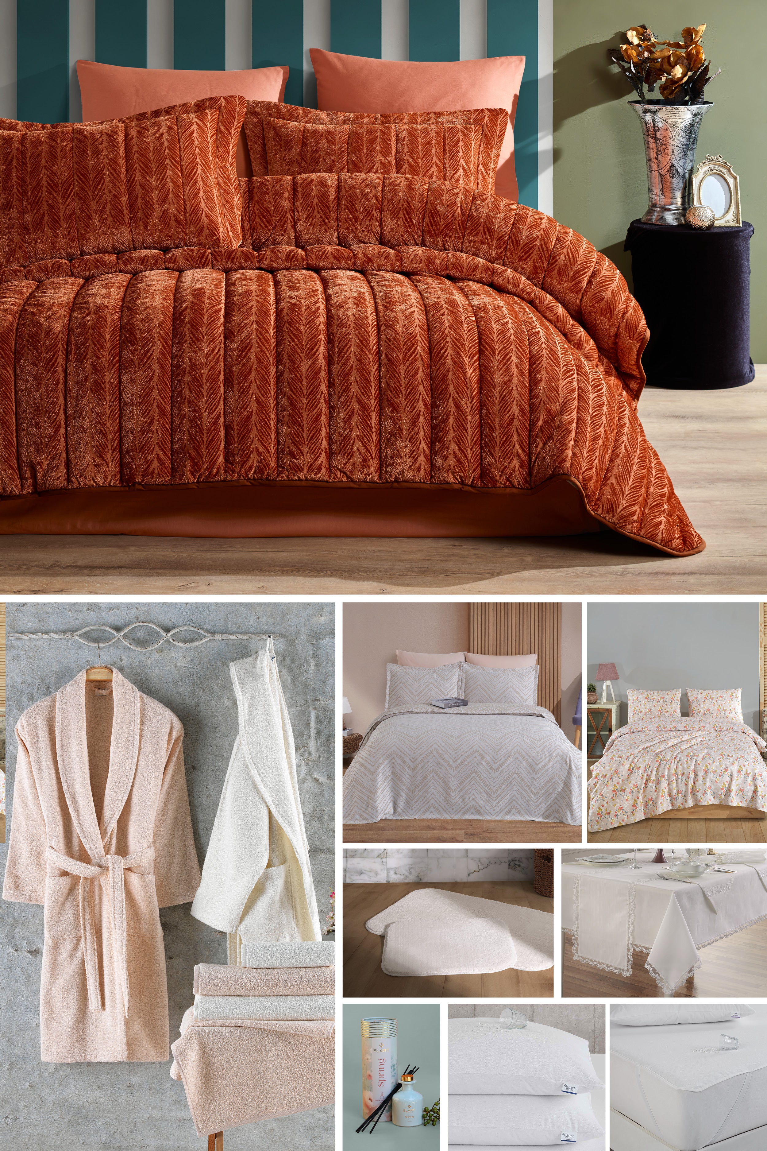 Tüm parçalar ile kapsayıcı ve tüm ev tekstili hazırlayacak dolulukta bir pakettir. Yatak örtüsü Kadife Comfort Set zamansız tasarım ürünüdür. Ürün kendi özel kutusu ve ambalajı ile gönderilir. Yatak örtüsünde ipeksi dokunuş hissi veren yumuşak kumaş kullanılmıştır. Paketin tüm parçaları evinizin günlük kullanıma uygun şekilde şık parçalardan oluşur. Günlük pamuk kumaştan oluşan tamamında %100 organik pamuk kullanılmıştır.