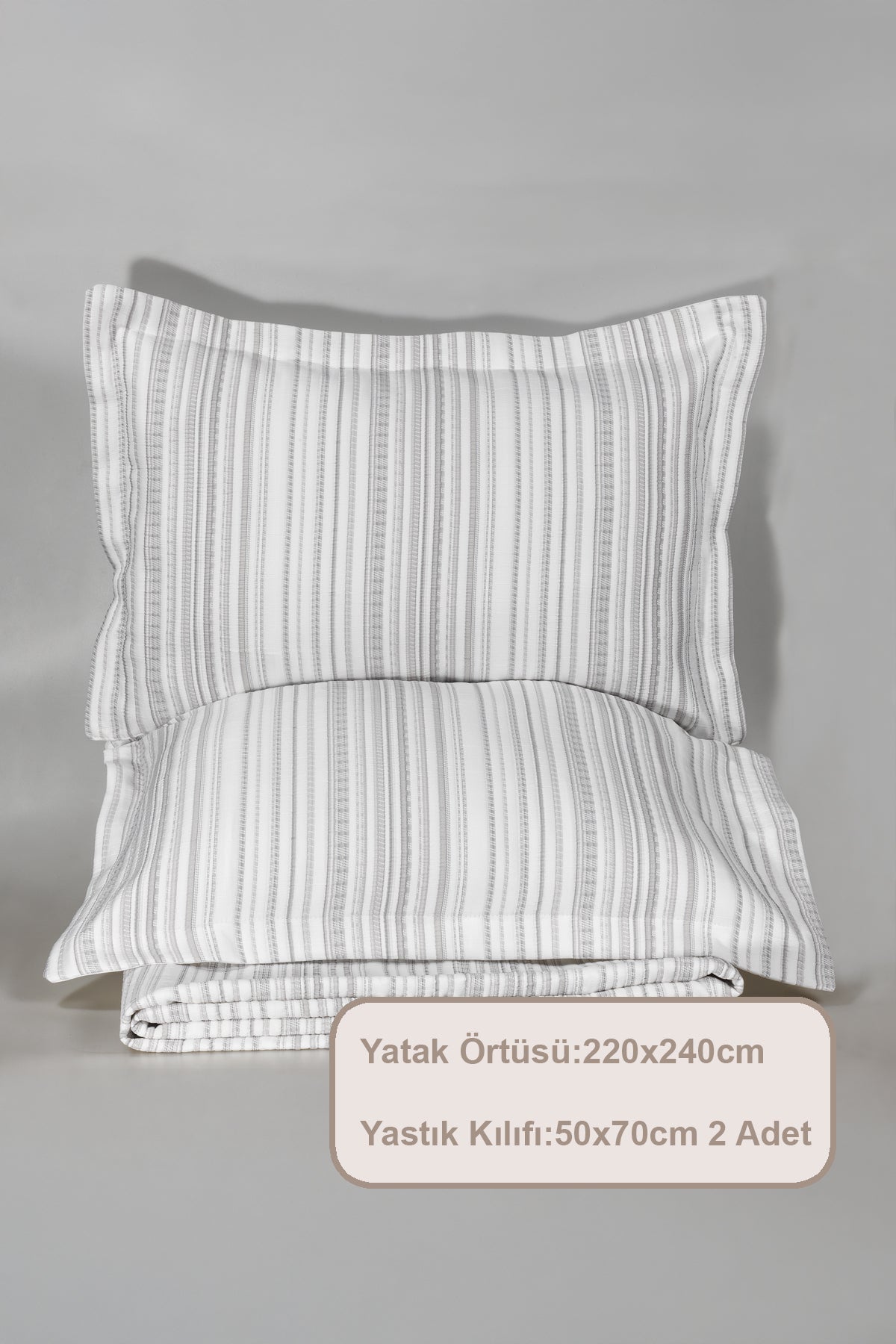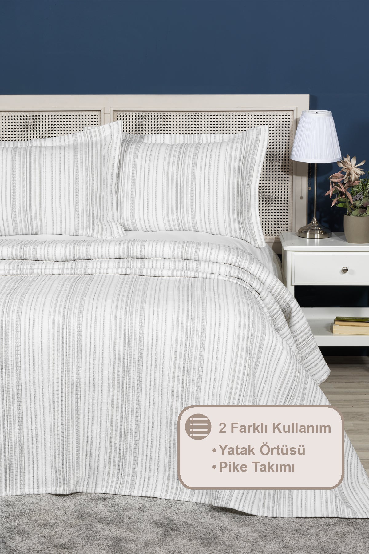3 parçadan oluşmaktadır. Soğuk havalarda yatak örtüsü olarak, sıcak havalarda ise şık bir pike olarak kullanabilirsiniz. Yumuşacık yapısıyla konforu, modern renkleriyle estetiği bir arada bulacaksınız. 240x250 cm ölçüsündeki yatak örtüsü, geniş yapısıyla çift kişilik yataklara mükemmel uyum sağlar. Dayanıklı ve kolay temizlenen yapısıyla ürünümüzü 30 derecede makinede yıkayarak günlük kullanımınızda konforu ve rahatlığı bulacaksınız. Kuru temizlemeye uygundur.
