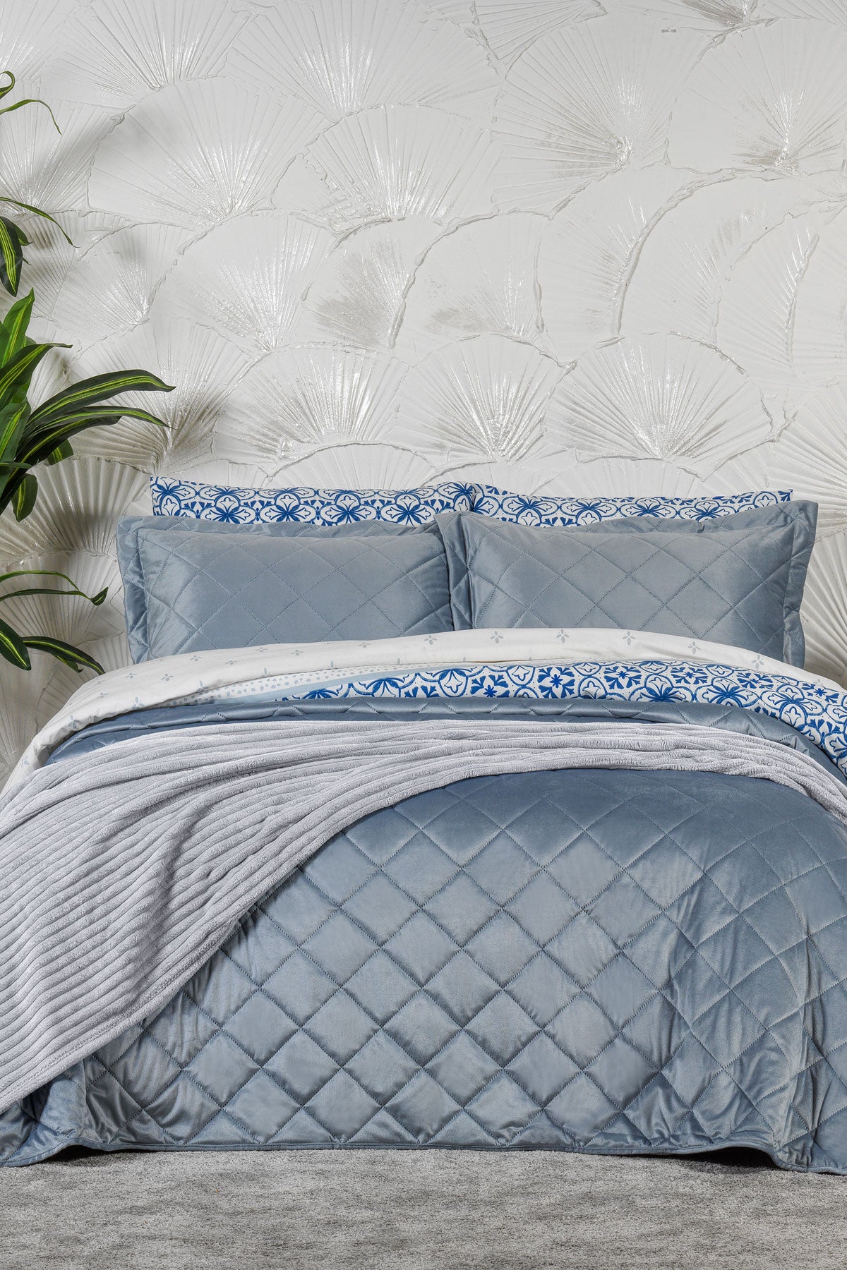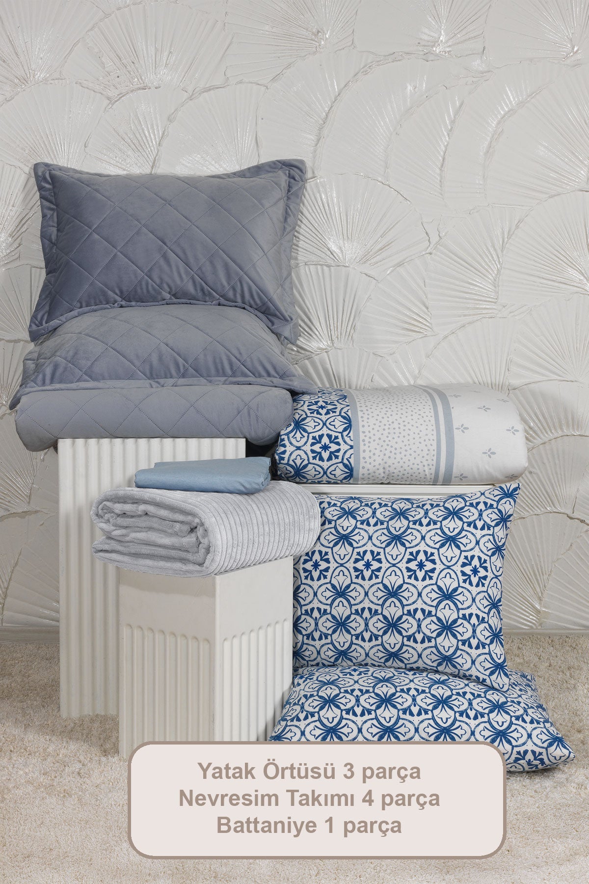 8 parçadan oluşmaktadır. Kombin set her mevsimde farklı kullanıma uygun parçalarıyla dekorasyonunuza uyum sağlayarak yatak odalarınıza modern ve zarif bir dokunuş getirecektir. Yatak örtüsünde kullanılan Fransız kadife kumaşın yumuşaklığı, modern kapitone deseni ile buluştu. Pamuklu nevresim takımı pamuklu kumaşı ile doğal hava geçirgenliği sağlayarak rahat ve konforlu bir uyku deneyimi sunar. Lastikli çarşafı, yatağınızın tamamını sıkı bir şekilde sararak kayma ve toplanma yapmaz. Battaniye; sıcak ve yumuşak yapısı ile soğuk havalarda vazgeçilmeziniz olacaktır. Günlük kullanıma uygun tüm parçalarıyla bu set; sıcak havalarda yatak örtüsünü, soğuk havalarda nevresim takımı ve battaniyeyi kullanarak dört mevsimde tüm ihtiyaçlarınıza pratik kullanım sunarak cevap verecektir. Dayanıklı ve makinede 30 derecede yıkanabilir parçalarıyla uzun yıllar keyifle kullanacaksınız. Kurutma makinasında düşük ısıda kurutma yapılabilir.