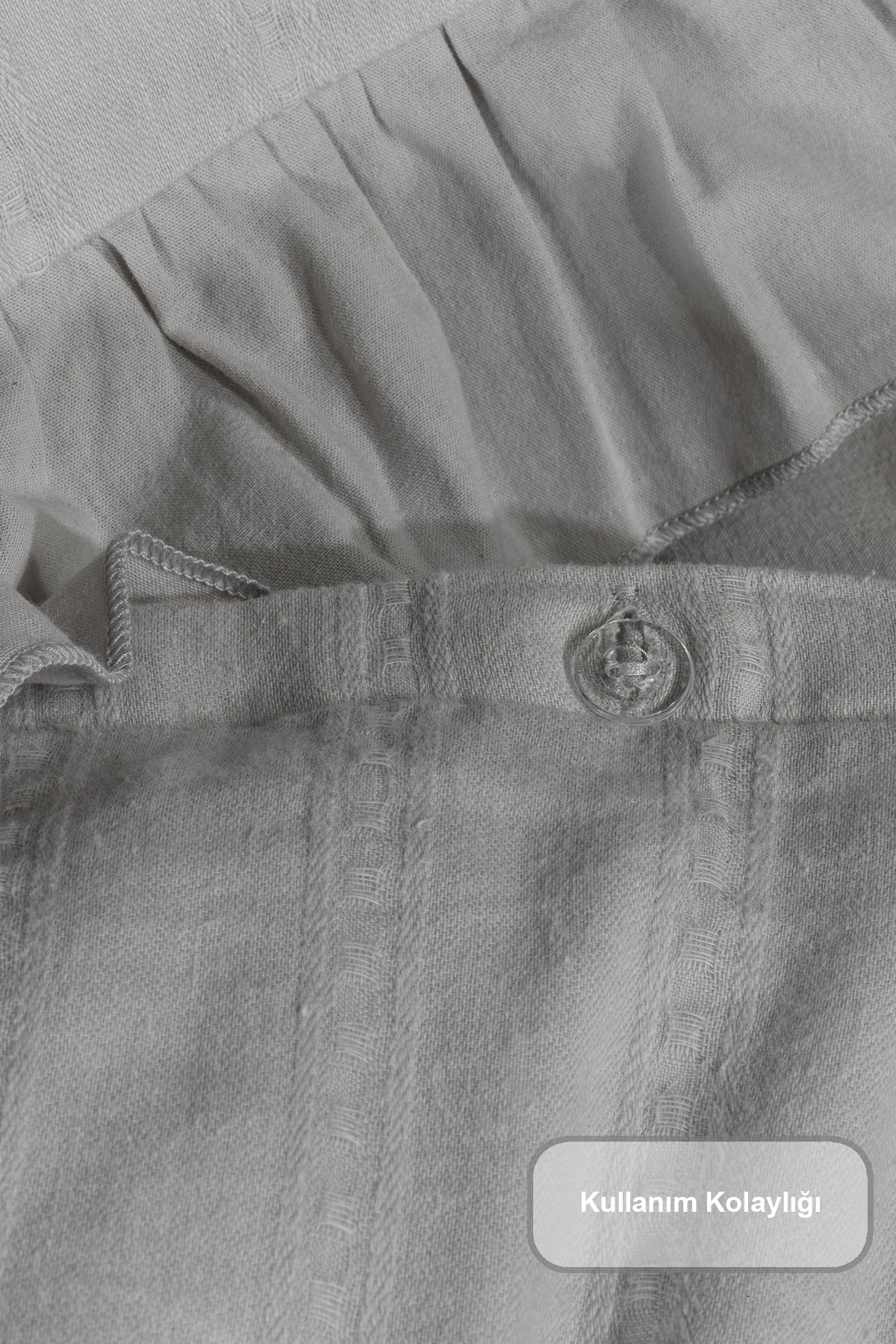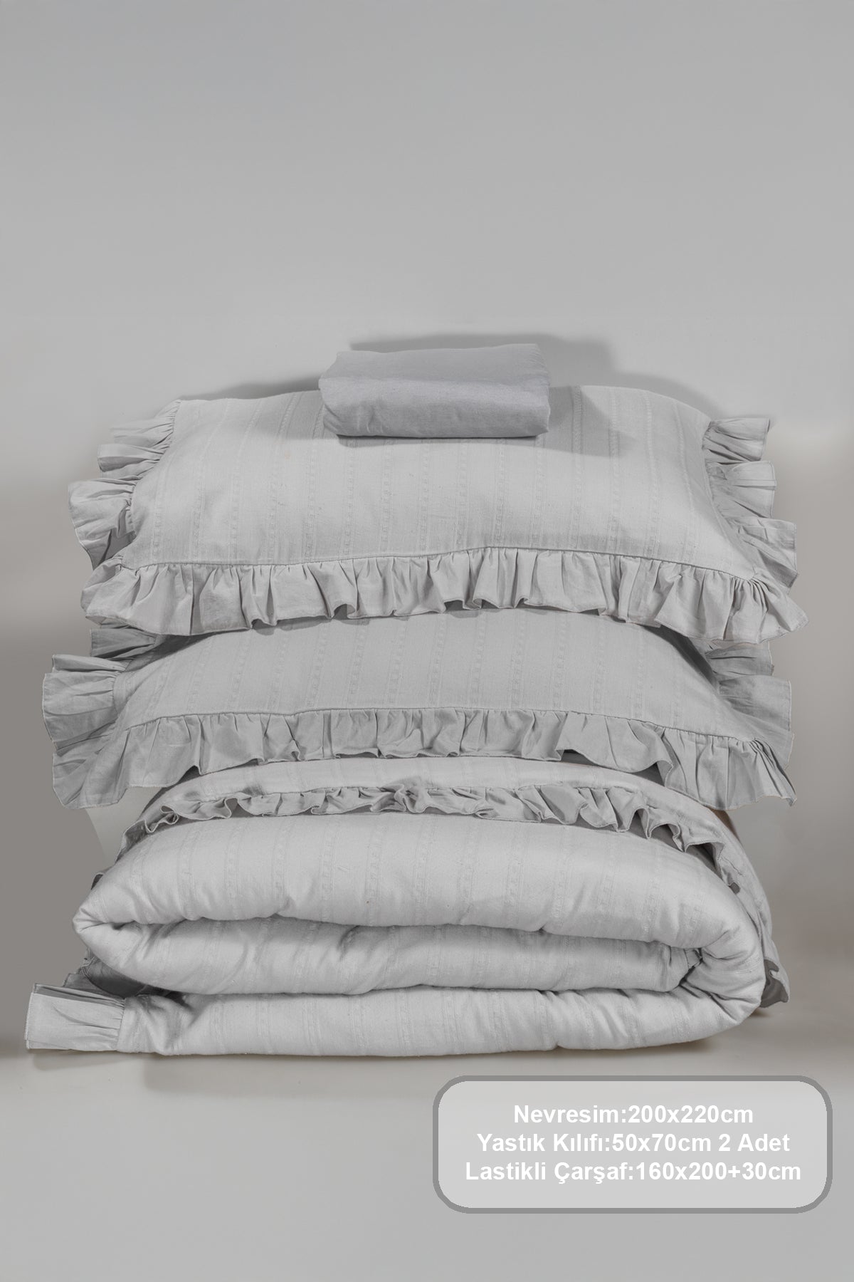4 parçadan oluşmaktadır. %100 pamuk kumaş; doğal hava geçirgen yapısı ve yüksek nem emici özelliği sayesinde terletmez. Rahat ve konforlu bir uyku deneyimi sunar. Cildi tahriş etmez ve insan sağlığına zarar vermez. Çift kat fırfırların ve soft renklerin romantik havası ile nevresim takımı farklı dekorasyon ve mevsim kullanımlarına uygundur. 54 tel dokuma sıklığı ile bu takım uzun ömürlü ve dayanıklıdır. Ürünümüzü 30 derecede makinede yıkayarak günlük kullanımınızda konforu ve rahatlığı bulacaksınız. Kurutma makinesi ve kuru temizleme önerilmez.