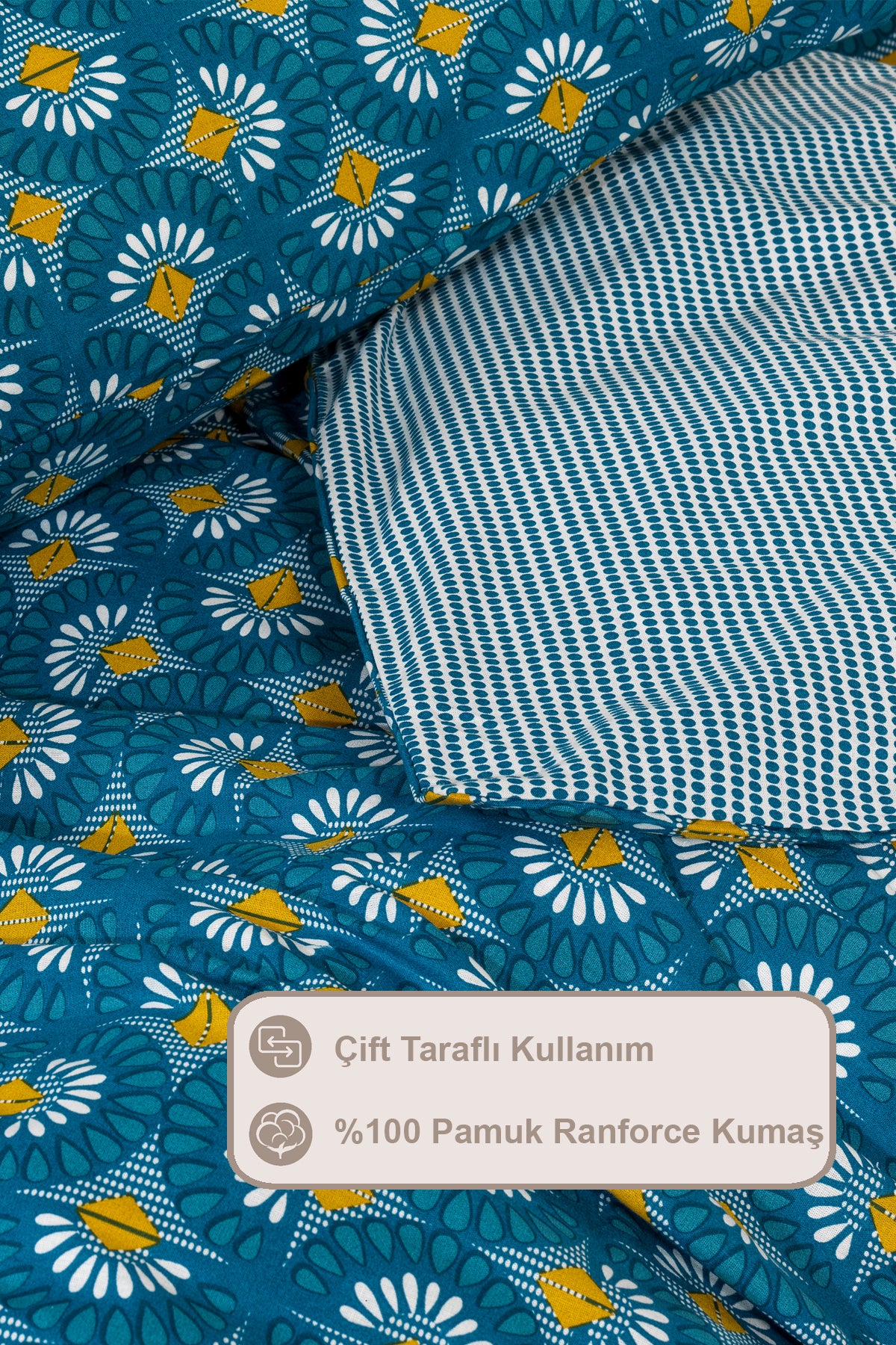 4 parçadan oluşmaktadır. %100 pamuk kumaş; doğal hava geçirgen yapısı ve yüksek nem emici özelliği sayesinde terletmez. Rahat ve konforlu bir uyku deneyimi sunar. Cildi tahriş etmez ve insan sağlığına zarar vermez. 54 tel dokuma sıklığı ile ranforce kumaş uzun ömürlü ve dayanıklıdır. Ürünümüzü 30 derecede makinede yıkayarak ilk günkü canlı renklerini kaybetmeden kullanabilirsiniz. Kurutma makinesi ve kuru temizleme önerilmez.