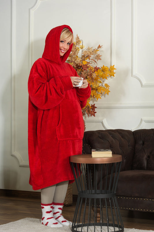 ELART Enjoy TV Battaniyesi Wellsoft Kapüşonlu Giyilebilir Unisex Over Size (80x110 cm) Kırmızı