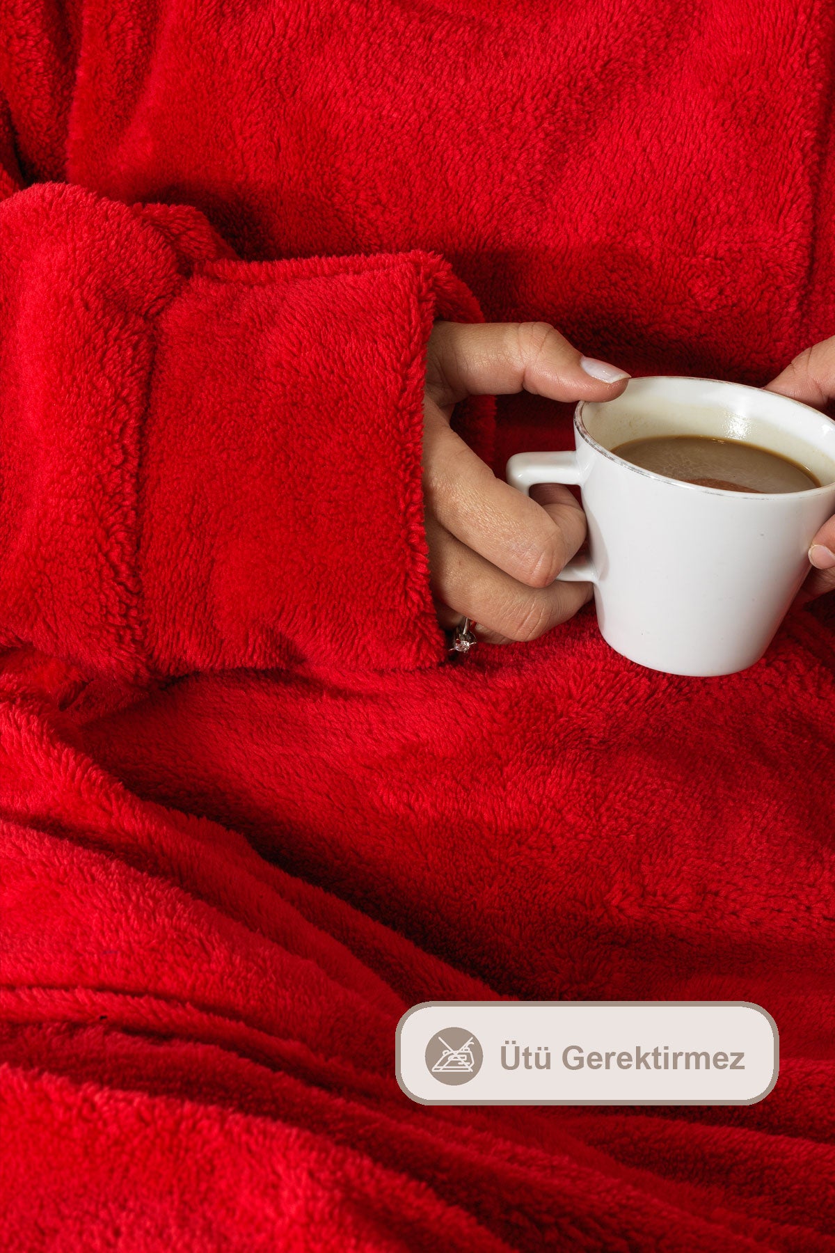 ELART Enjoy TV Battaniyesi Wellsoft Kapüşonlu Giyilebilir Unisex Over Size (80x110 cm) Kırmızı