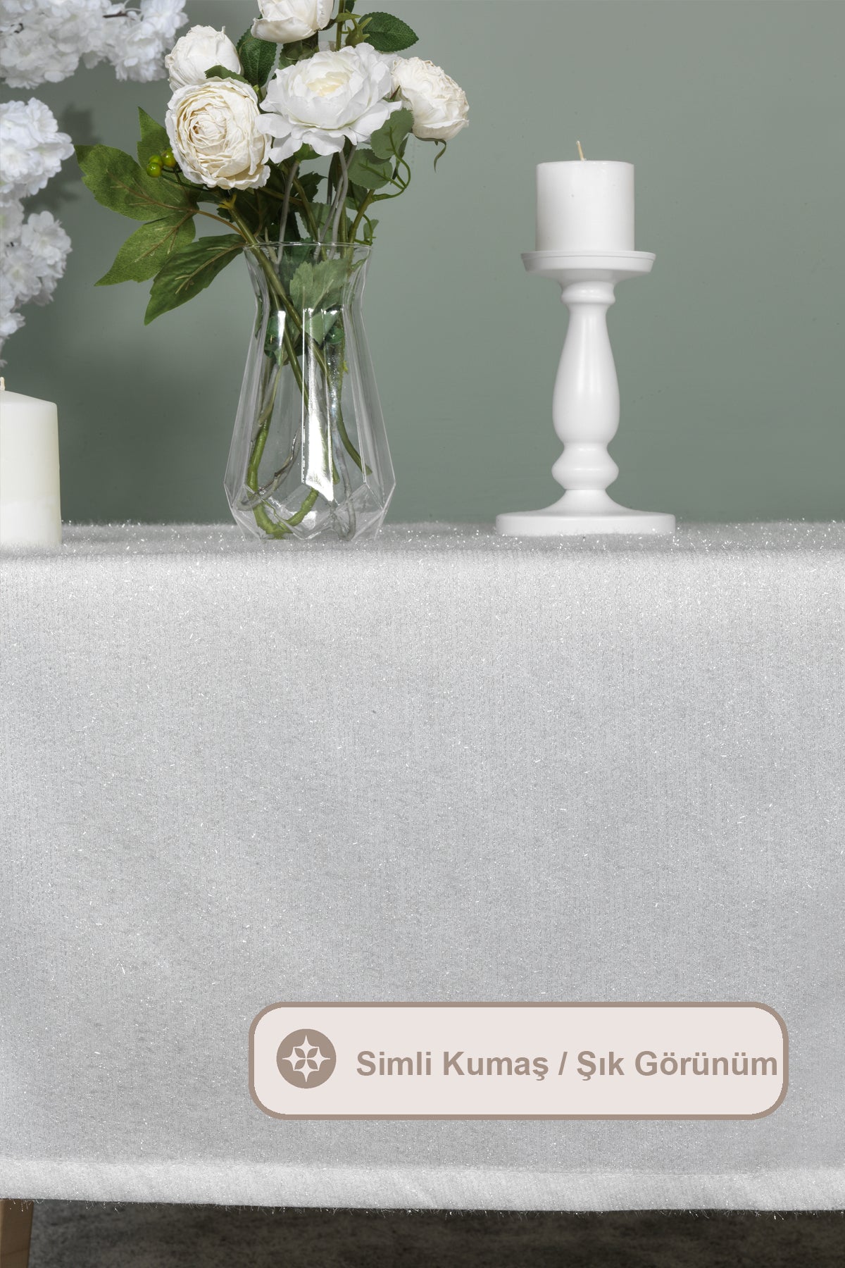 1 parçadan oluşmaktadır. Zarif ışıltılı simlerle bezenmiş dokuma kumaş masa örtüsü şık görünümü ile nişan, söz, doğum günü gibi özel günlerinizde masa dekorasyonunuzu şıklığıyla tamamlayacaktır. Sofralarınıza zarif bir dokunuş katacaktır. Dayanıklı ve kolay temizlenen yapısıyla masa örtünüzü düşük devirde hassas programda yıkayarak ilk günkü formunu koruyabilirsiniz. Kurutma makinesi ve kuru temizleme önerilmez.
