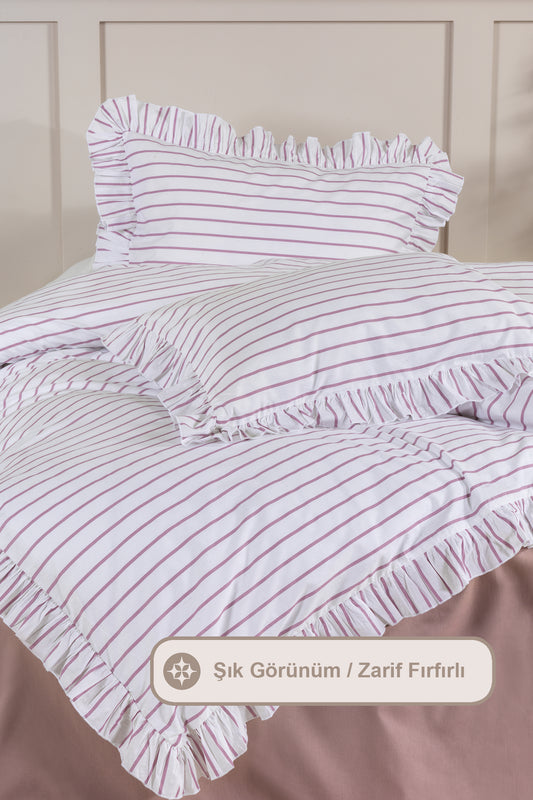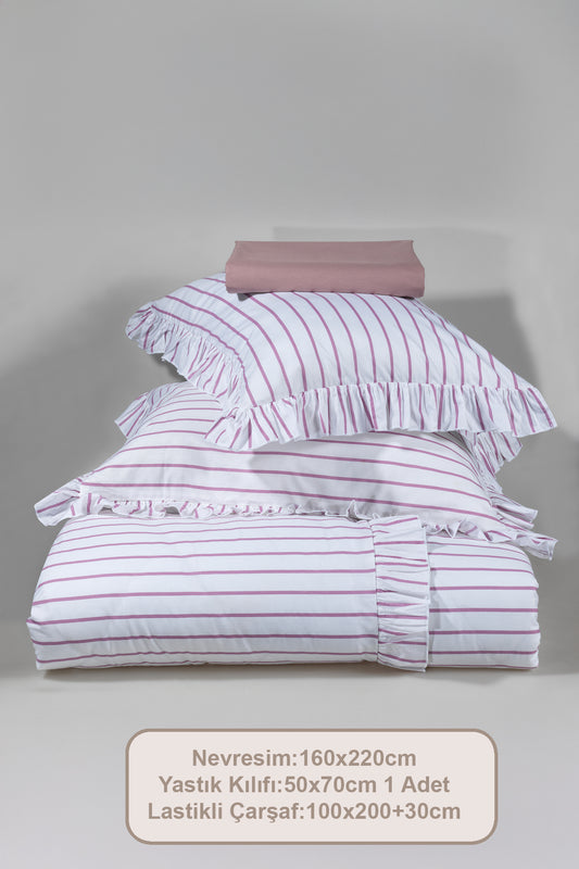 ELART Lara Nevresim Takımı Tek Kişilik Lastikli Çarşaf %100 Pamuk Ranforce Fırfırlı (160x220 cm) Gülkurusu