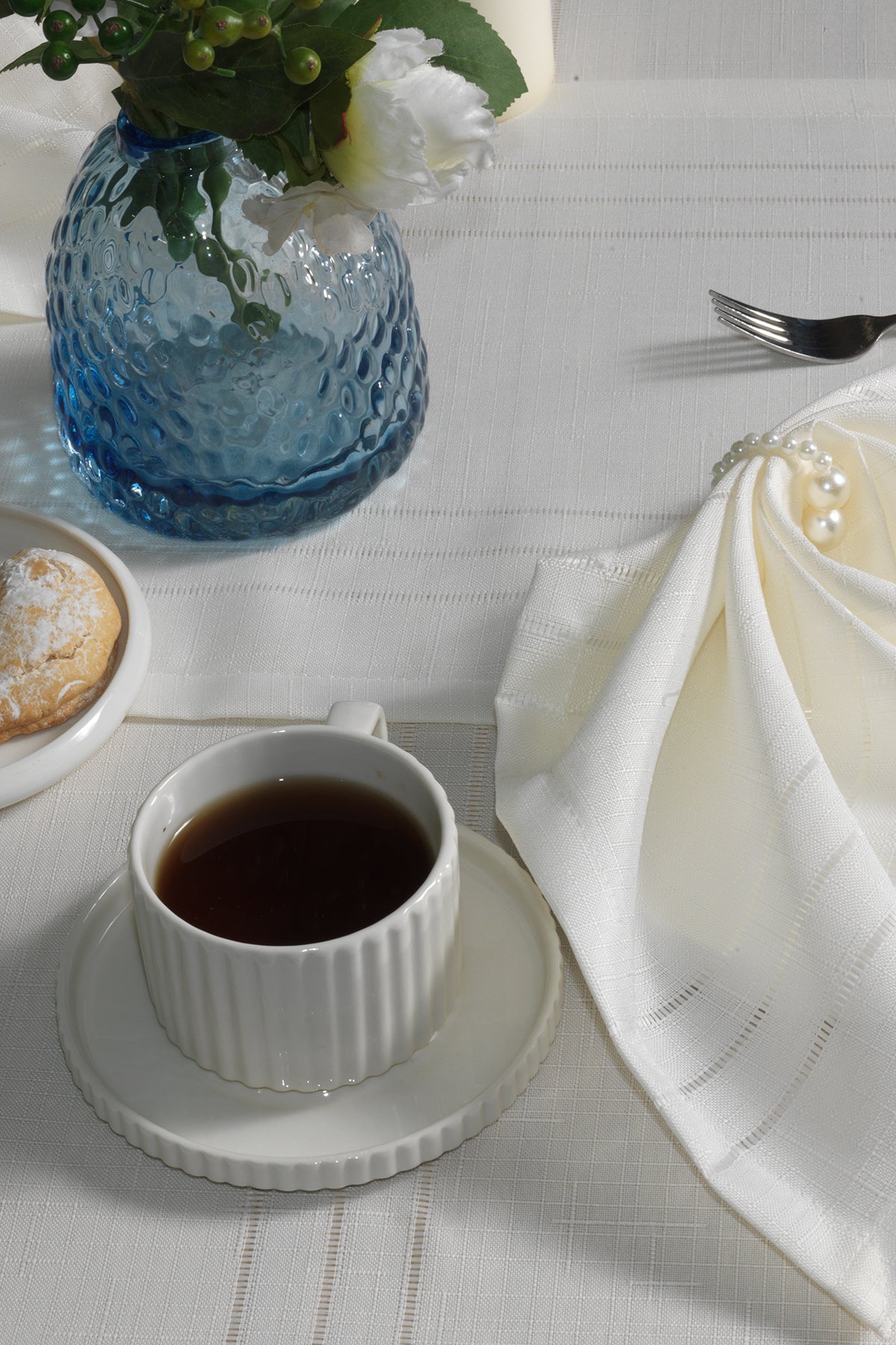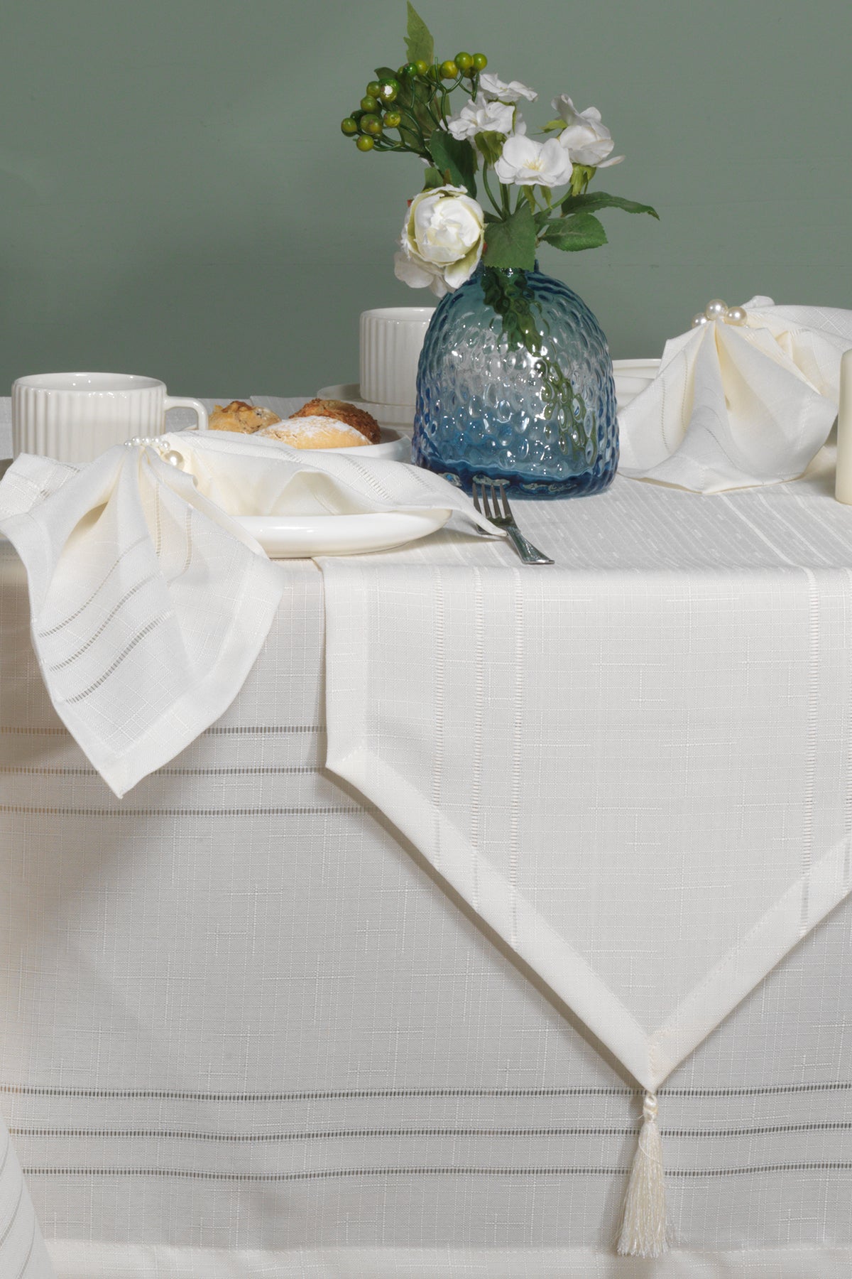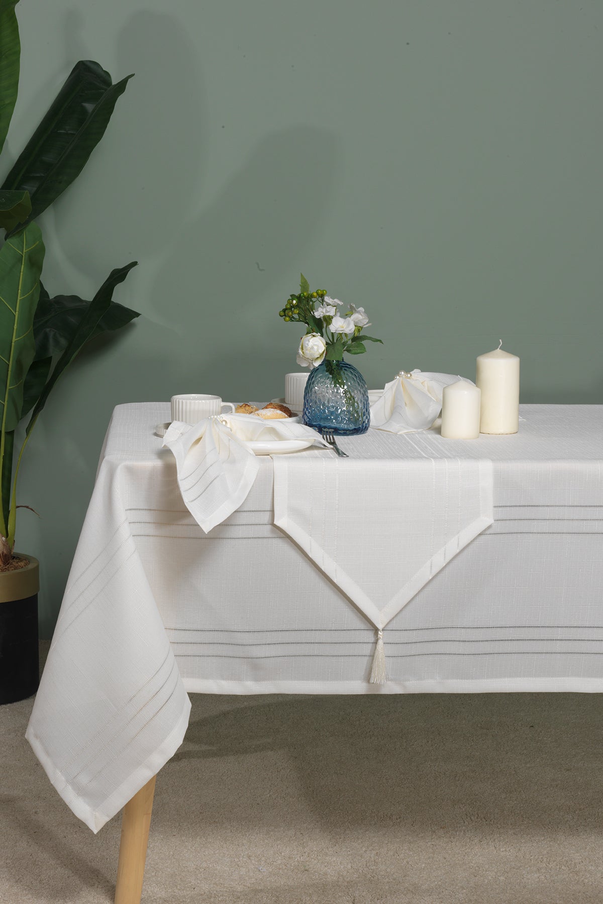 26 parçadan oluşmaktadır. Jakar dokuma tekniği ile üretilen masa örtüsü takımı, sofralarınıza modern bir dokunuş katar. Sade ve çizgisel deseni ile her türlü masa düzenine uyum sağlar. Tüm parçalarıyla şık bir sofrada ihtiyaçlarınızı karşılayacaktır. Dayanıklı ve kolay temizlenen yapısıyla masa takımınızı düşük devirde yıkayarak ilk günkü formunu koruyabilirsiniz. Kurutma makinesi ve kuru temizleme önerilmez.