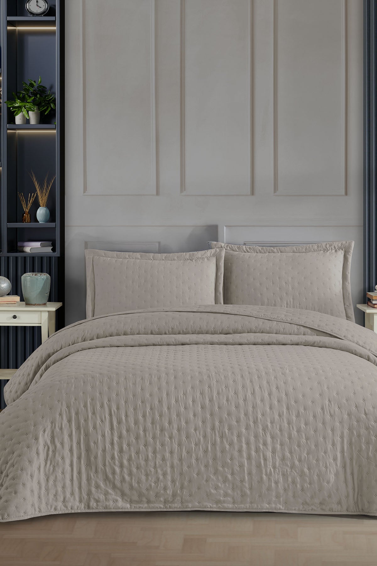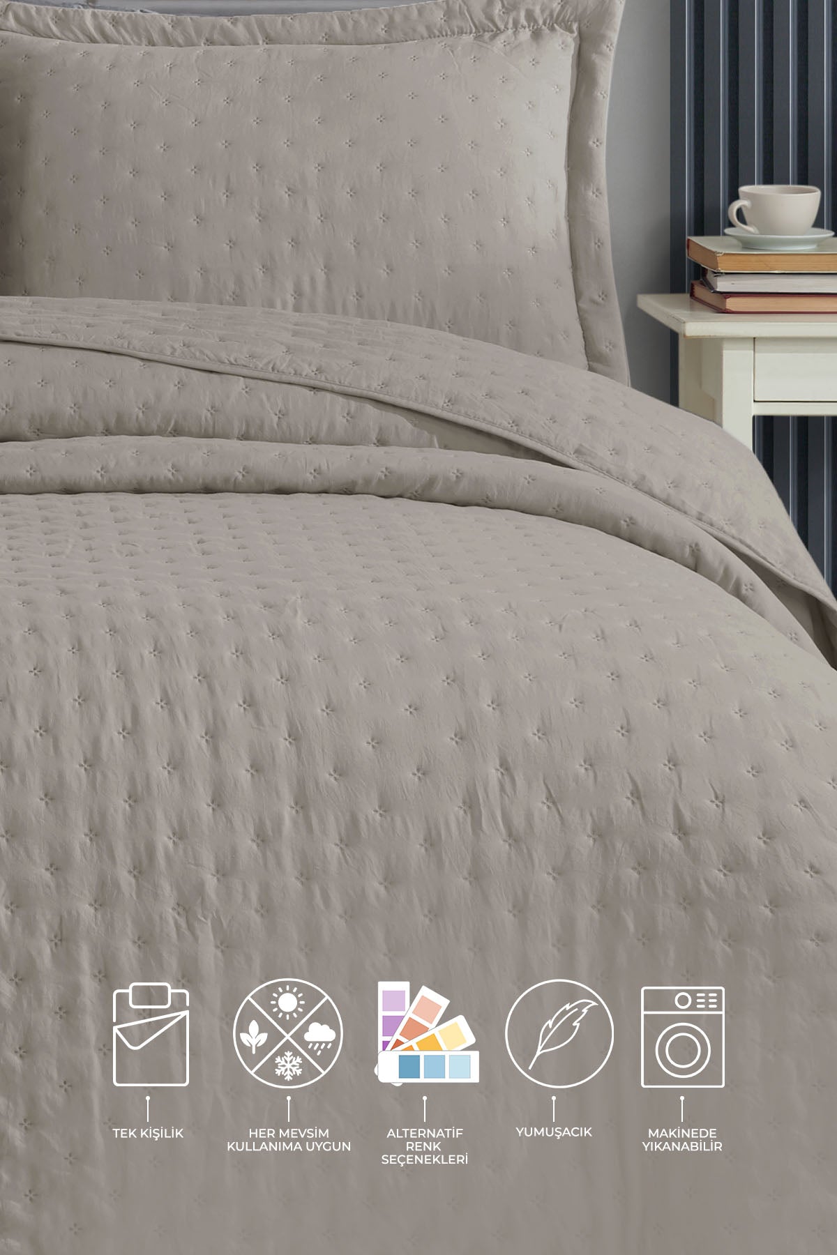 Helena Yatak Örtüsü Seti, sade çizgileri ve hafif dokusuyla hem şık hem de konforlu bir kullanım sunar. 180x240 cm ölçülerindeki yatak örtüsü, tek kişilik yataklar için ideal genişlikte olup odanızda derli toplu ve modern bir görünüm oluşturur.