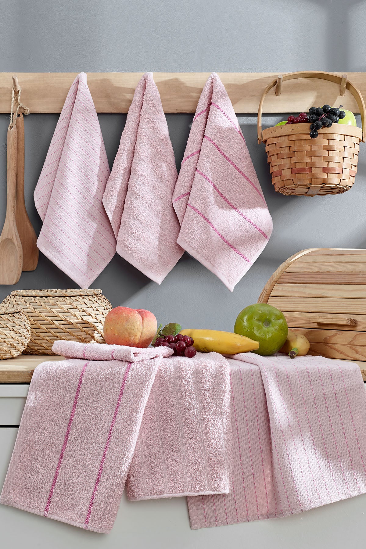 Sophia Mutfak Havlusu Seti, 45x30 cm ölçülerindeki 6 adet havludan oluşur. Yumuşak dokusu ve emici yapısı sayesinde mutfakta günlük kullanım için idealdir. Kurulama, el kuruma, tezgâh silme gibi birçok işlevde güvenle kullanabilirsiniz.