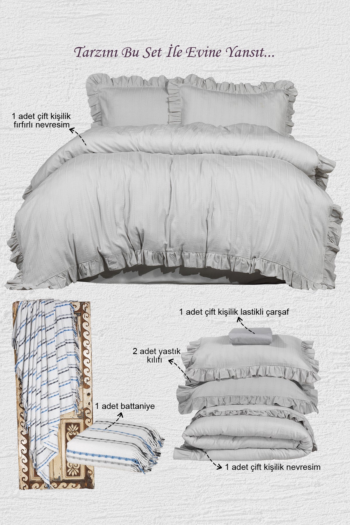 Arden Romantik Kombin Set Çift Kişilik Çeyiz Seti 5 Parça Gri