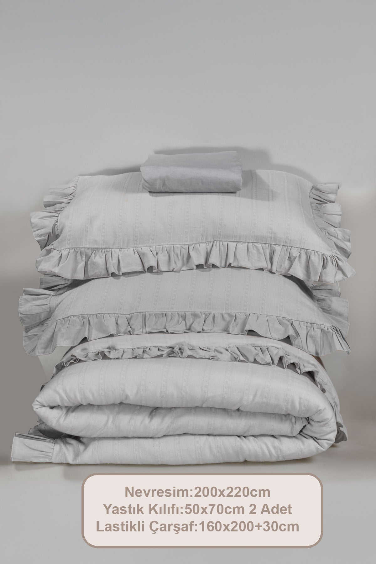 Nevresim: %100 pamuk kumaş; doğal hava geçirgen yapısı ve yüksek nem emici özelliği sayesinde terletmez. Rahat ve konforlu bir uyku deneyimi sunar. Cildi tahriş etmez ve insan sağlığına zarar vermez. Çift kat fırfırların ve soft renklerin romantik havası ile nevresim takımı farklı dekorasyon ve mevsim kullanımlarına uygundur. 54 tel dokuma sıklığı ile bu takım uzun ömürlü ve dayanıklıdır.