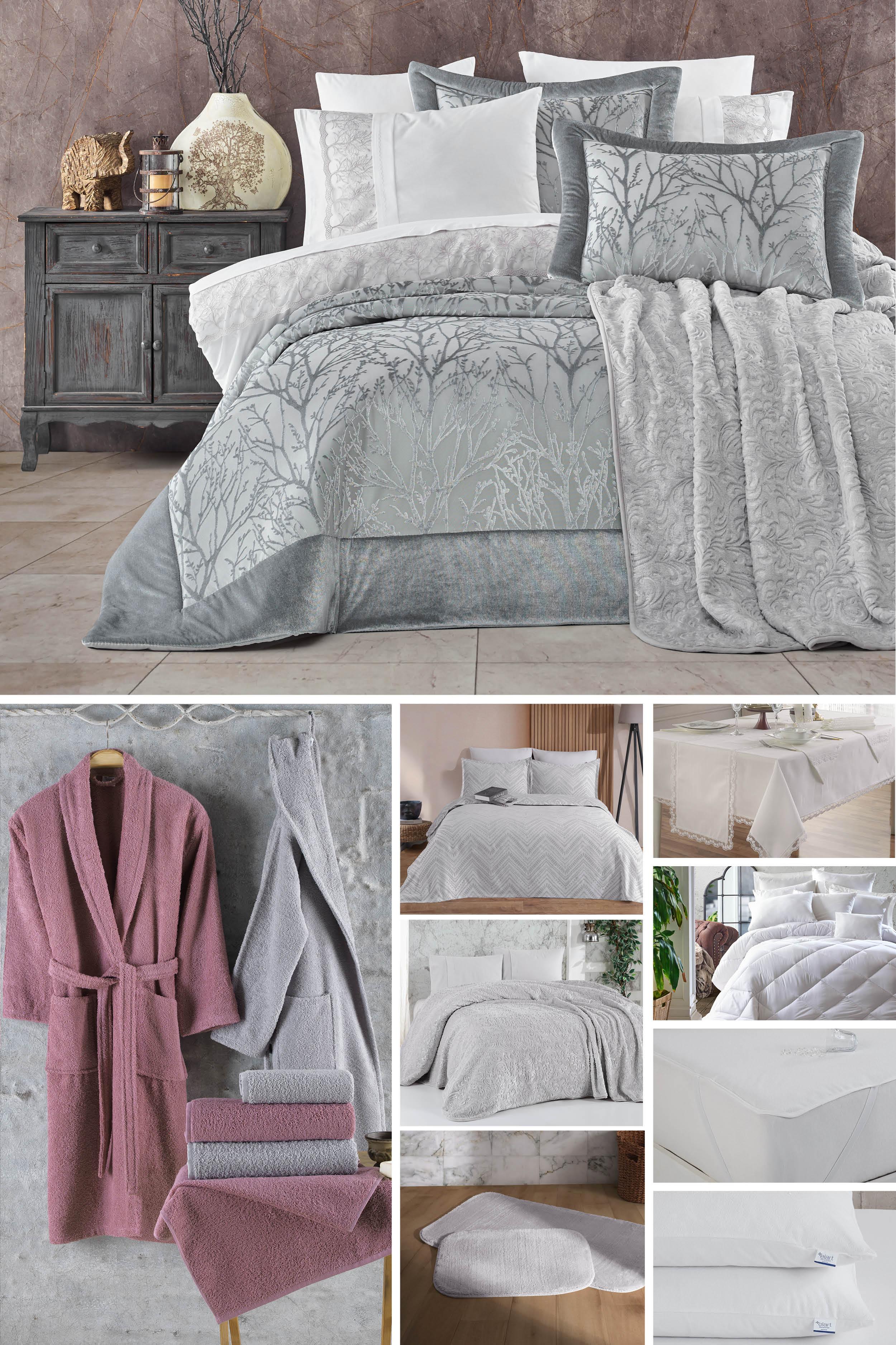 Bahar Çeyiz Paketi tüm parçaları ile kapsayıcı ve tüm ev tekstili ihtiyaçlarınıza cevap verecek dolulukta bir pakettir. Yatak örtüsü özel şık çeyizlik bavul kutusunda ve her ürün kendi özel kutu ve ambalajı ile gönderilir. Yatak örtüsünde ipeksi dokunuş hissi veren özel kadife kumaş kullanılmıştır. Ürünümüz fiyat olarak kampanyalıdır. Birkaç parça ürüne vereceğiniz tutar yerine tüm tekstil ürünlerini bir arada alabileceksiniz. Paketin içerisindeki tüm parçalar evinizin günlük kullanımına uygun parçalardan oluşmaktadır. Günlük pamuk kumaştan oluşan ürünlerin tamamında %100 organik pamuk kullanılmıştır.