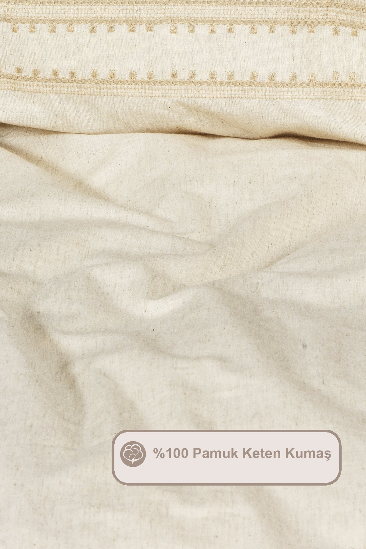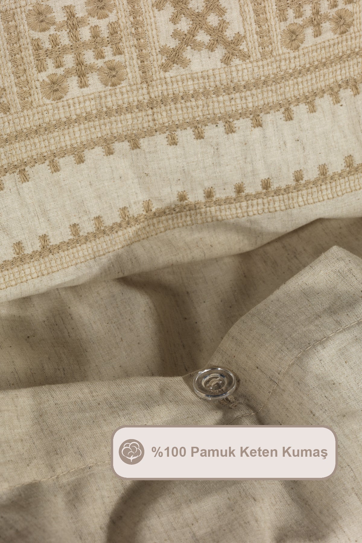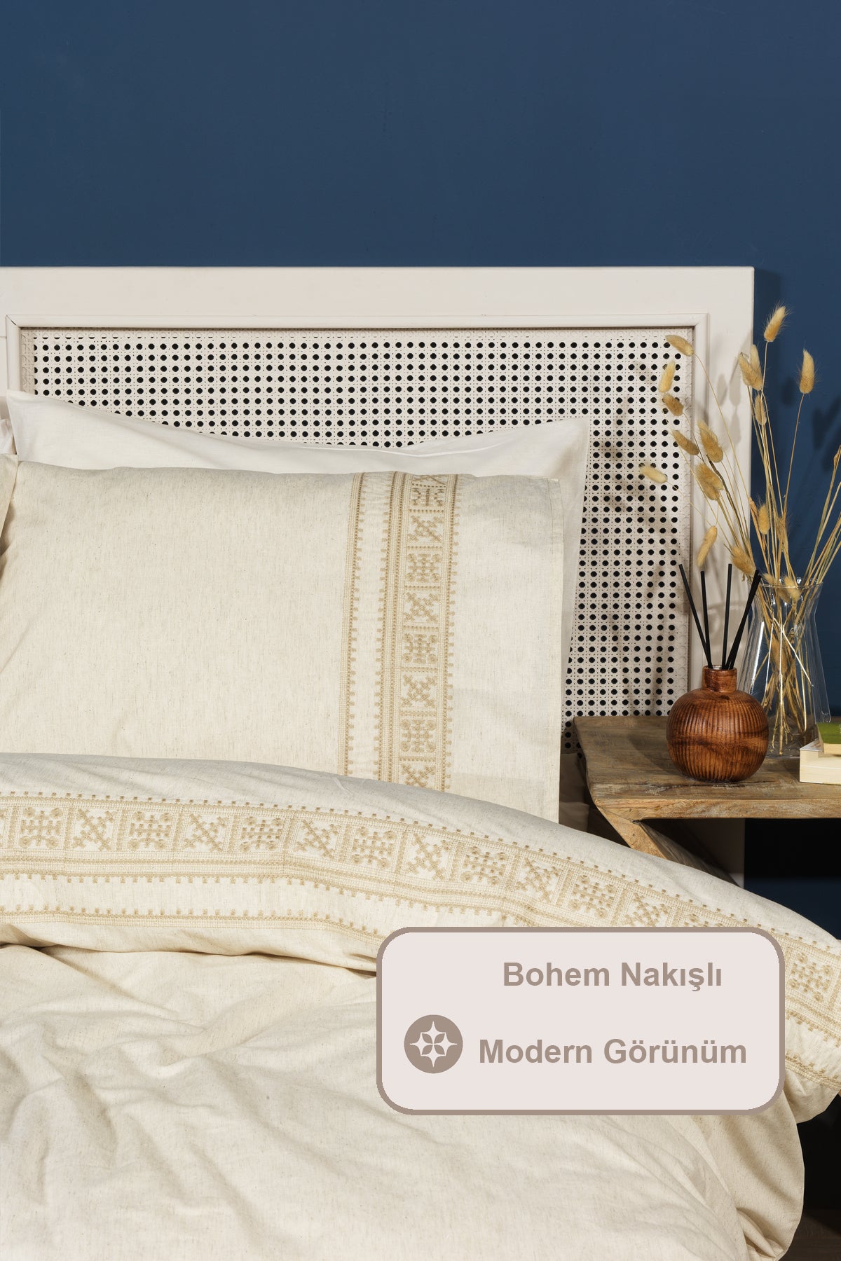 6 parçadan oluşmaktadır. Bohem şıklığın ve doğal dokuların büyüsünü yatak odanıza taşımaya hazır mısınız? Ketenin asil duruşu ile pamuğun yumuşacık dokusunu buluşturan bu özel nevresim takımı, sadece bir uyku ürünü değil, aynı zamanda huzurlu bir yaşam alanının en şık tamamlayıcısı olacak. Her detayıyla özenle tasarlandı. Zarif nakış işlemeleri, hafif ve nefes alabilir kumaş özellikleri sayesinde dört mevsim rahatlıkla kullanılabilir. Keten-pamuk kumaşın doğal dokusu, vücuda temas ettiğinde yumuşak ve serin bir his bırakır. Doğal hava geçirgen yapısı ve yüksek nem emici özelliği sayesinde terletmez. Rahat ve konforlu bir uyku deneyimi sunar. Cildi tahriş etmez ve insan sağlığına zarar vermez. Ürünümüzü 30 derecede makinede yıkayarak günlük kullanımınızda konforu ve rahatlığı bulacaksınız. Kurutma makinesi ve kuru temizleme önerilmez.