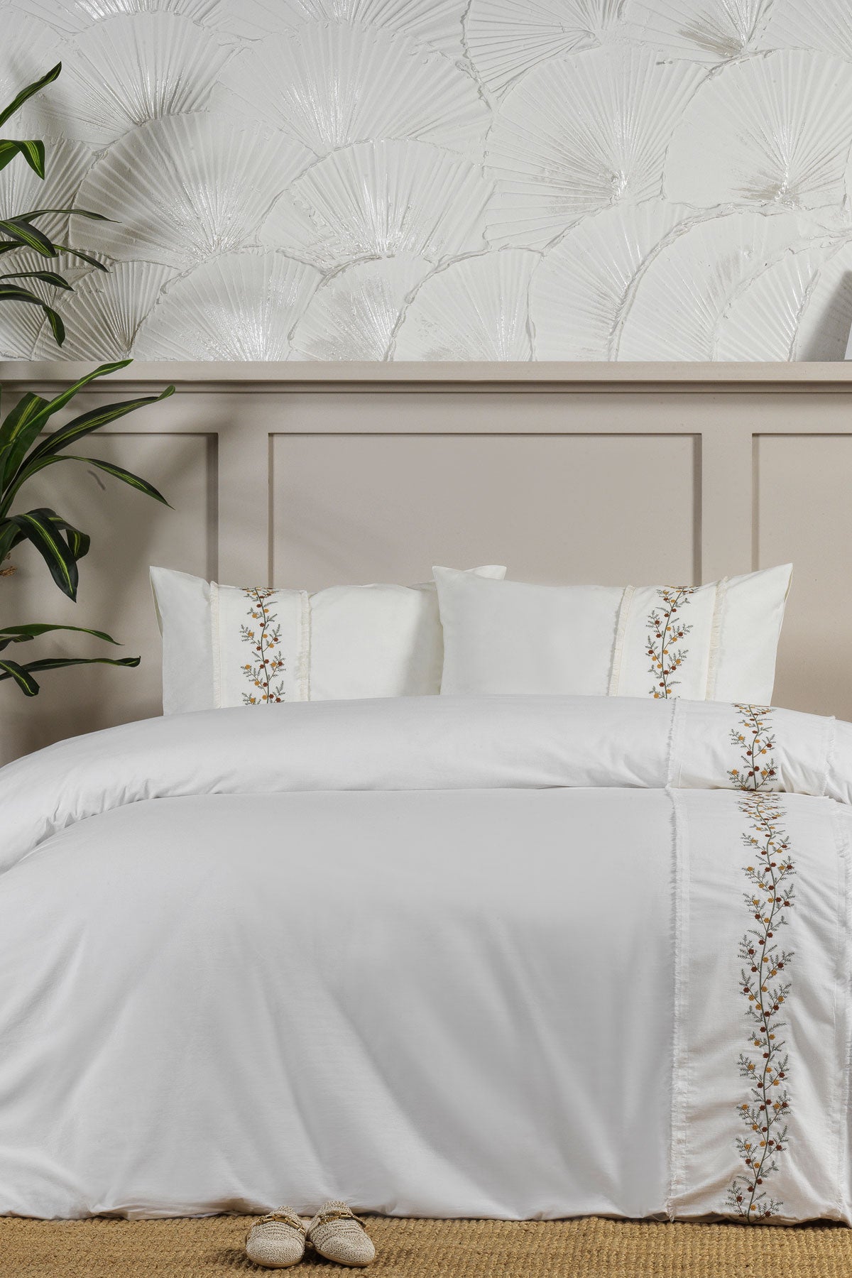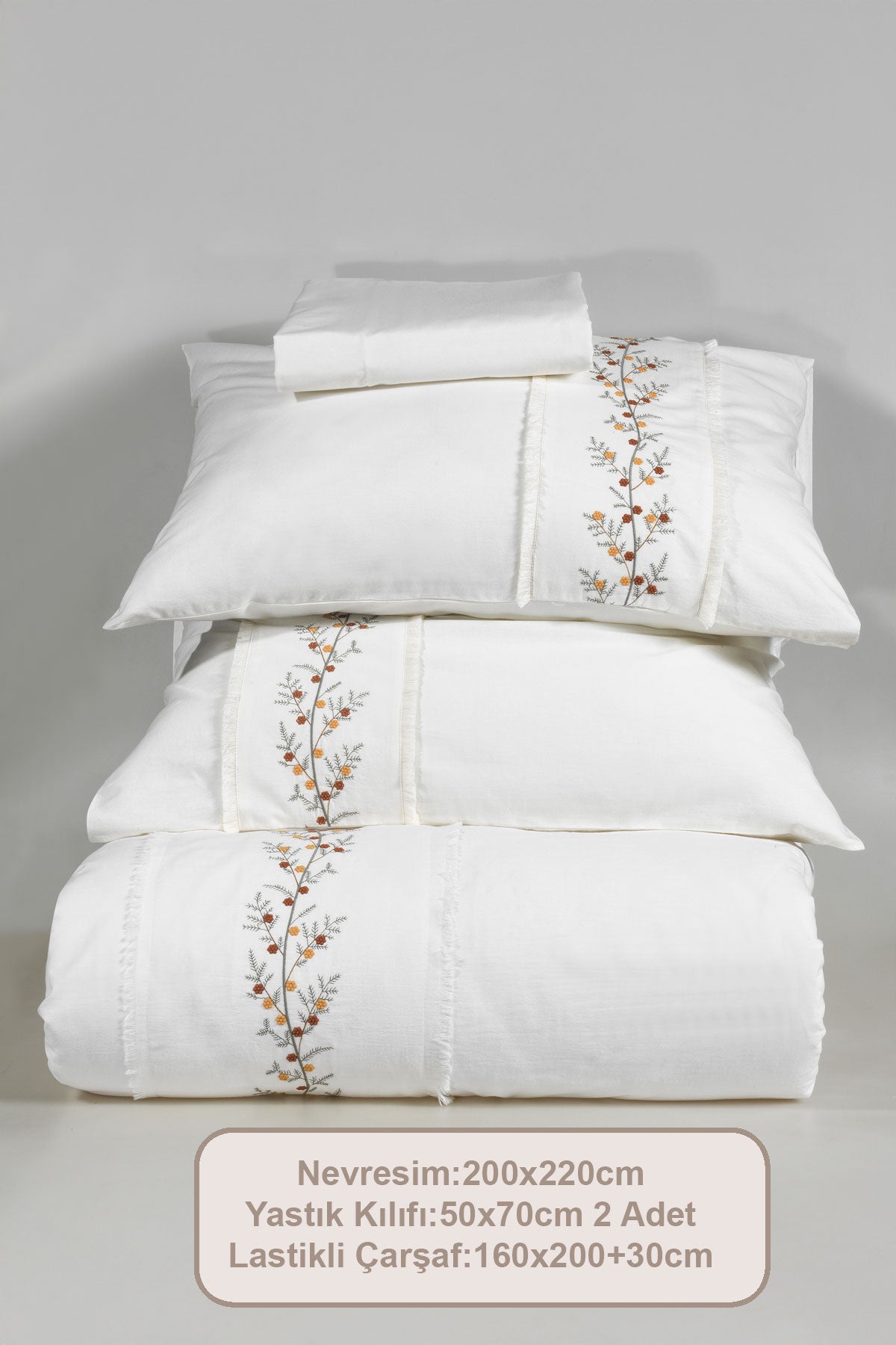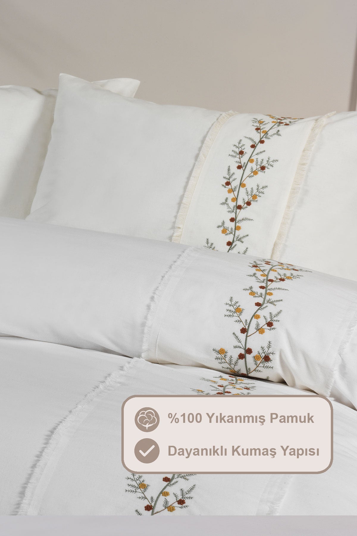 4 parçadan oluşmaktadır. Yıkama işlemi %100 pamuk kumaşa yumuşak bir doku kazandırarak her yıkamada bu hissi daha fazla hissedersiniz. Yıkanmış kumaş doğal hava geçirgen yapısı ve yüksek nem emici özelliği sayesinde terletmez. Rahat ve konforlu bir uyku deneyimi sunar. Cildi tahriş etmez ve insan sağlığına zarar vermez. Yatağın tüm üzerini kaplayan geniş nakışın zarif görünümü ve doğadan ilham alan natürel renk tonlarıyla evinizin dekorasyonuna kolayca uyum sağlayacaktır. 57 tel dokuma sıklığı ile bu takım uzun ömürlü ve dayanıklıdır. Ürünümüzü 30 derecede makinede yıkayarak günlük kullanımınızda konforu ve rahatlığı bulacaksınız. Kurutma makinesi ve kuru temizleme önerilmez.