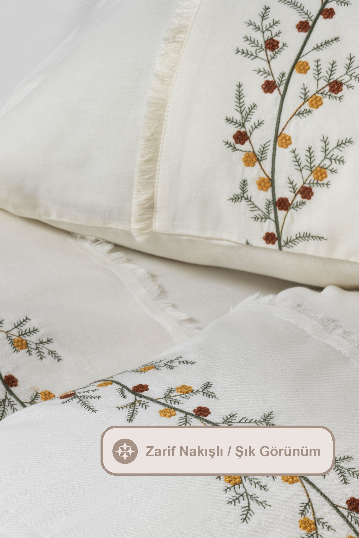 ELART Belissa Nevresim Takımı Çift Kişilik Lastikli Çarşaf %100 Pamuk Nakışlı (200x220 cm) Hardal