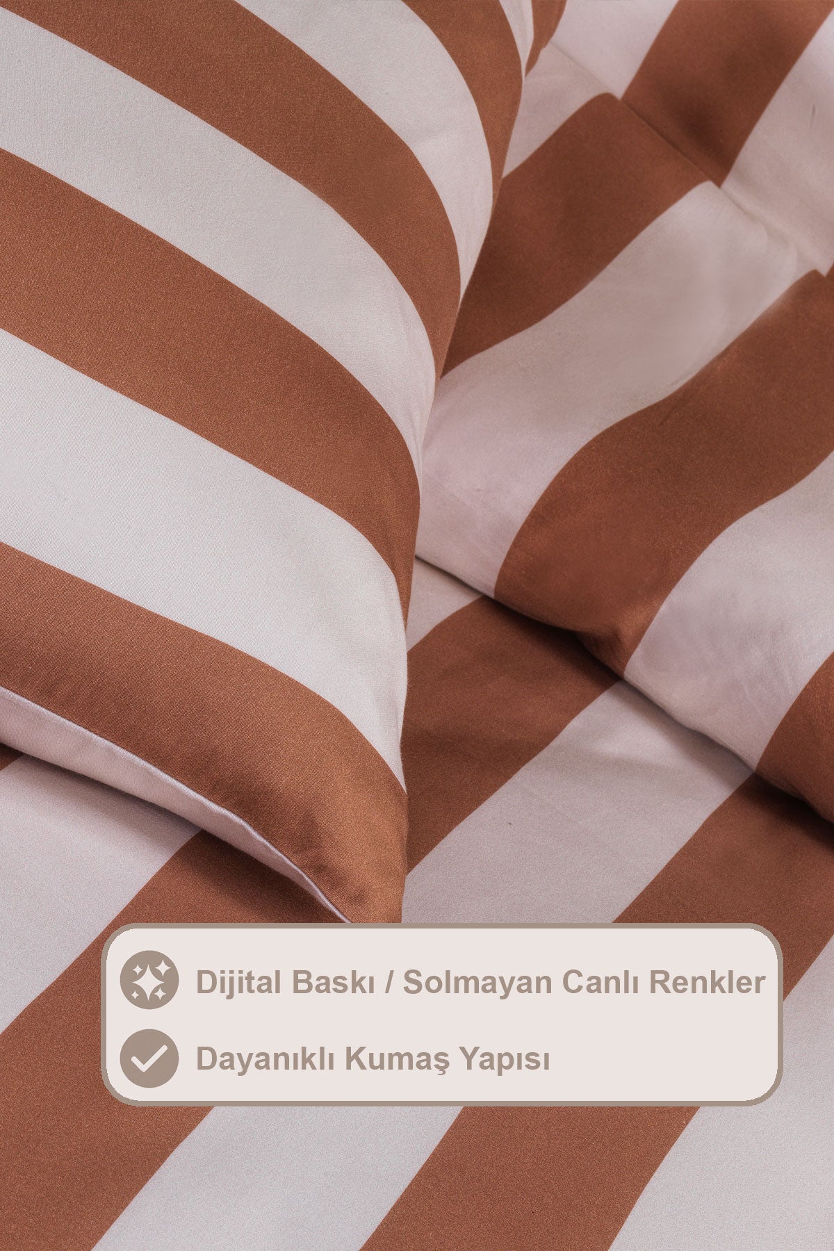 3 parçadan oluşmaktadır. Parlak satenin zarif dokusu, dijital baskının canlı ve net renkleriyle buluşuyor. Modern teknolojiyle üretilen özel baskılar, her detayda renklerin ışıltısını korurken, %100 pamuk saten dokusu cildinize yumuşak bir temas sunar. Doğal hava geçirgen yapısı ve yüksek nem emici özelliği sayesinde terletmez. Rahat ve konforlu bir uyku deneyimi sunar. Cildi tahriş etmez ve insan sağlığına zarar vermez. Modern çizgisel tasarımı ile yatak odanıza estetik bir hava katarak konforlu uykunun keyfini yaşatır. 82 tel dokuma sıklığı ile bu takım uzun ömürlü ve dayanıklıdır. Ürünümüzü 30 derecede makinede yıkayarak günlük kullanımınızda konforu ve rahatlığı bulacaksınız. Kurutma makinesi ve kuru temizleme önerilmez.