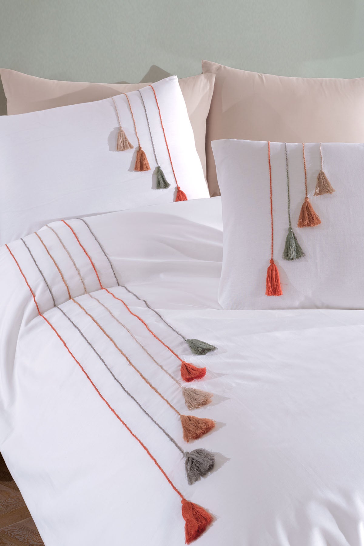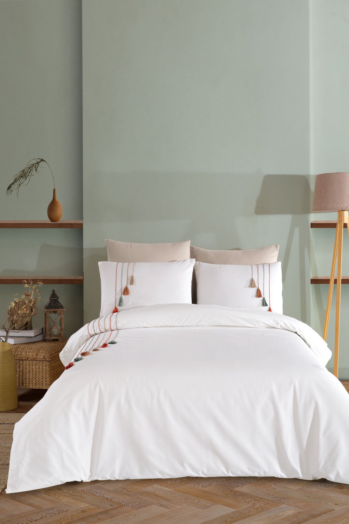 Carmen Nevresim Takımı, püskül detayları ve %100 pamuk kumaşıyla hem şık hem de konforlu bir uyku deneyimi sunar. Cildinize dost, nefes alabilen yapısı sayesinde dört mevsim rahatlıkla kullanabilirsiniz.