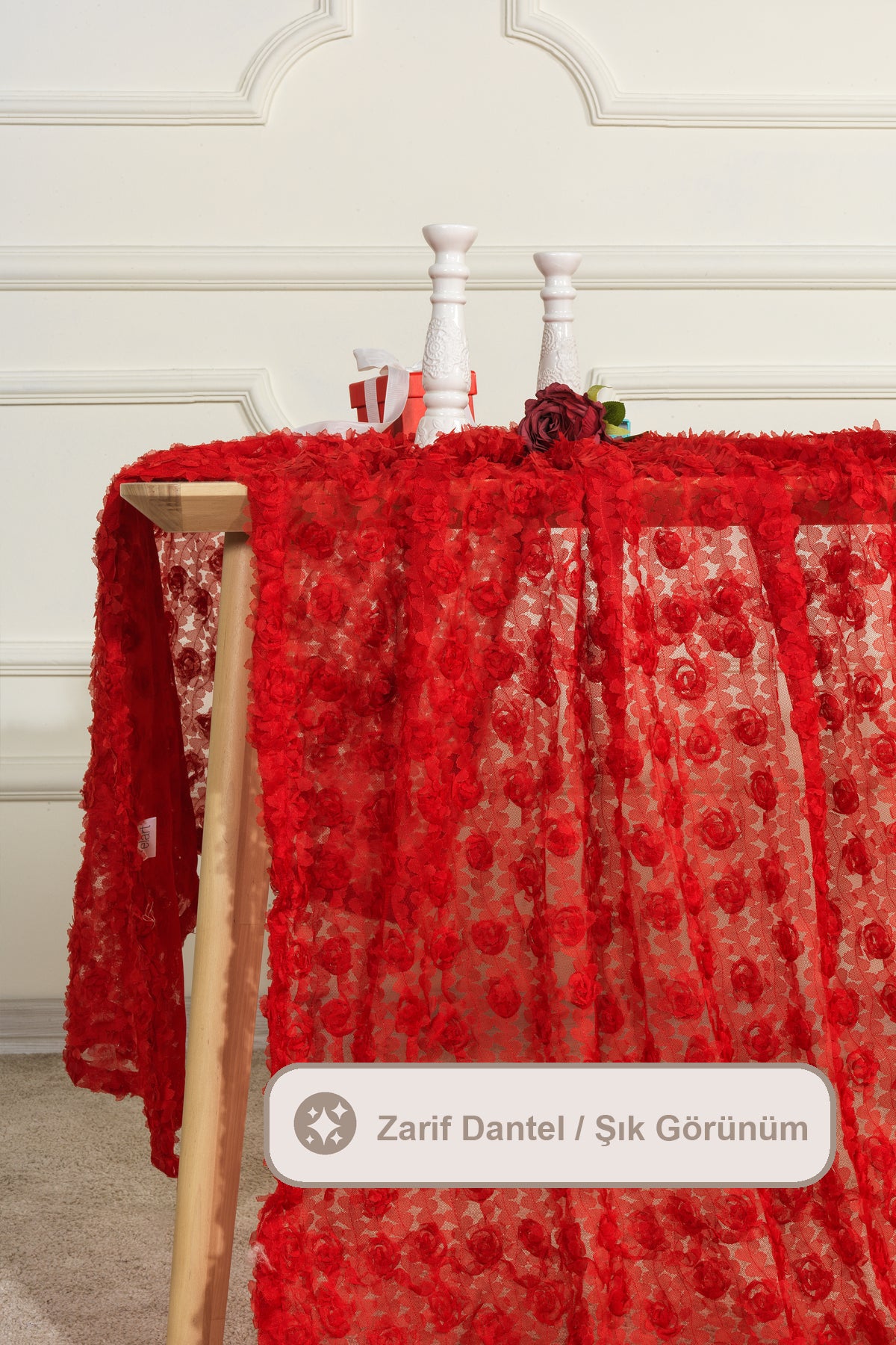1 parçadan oluşmaktadır. Gül motifleriyle bezenmiş masa örtüsü 3 boyutlu şık görünümü ile nişan, söz, doğum günü gibi özel günlerinizde masa dekorasyonunuzu şıklığıyla tamamlayacaktır. Sofralarınıza zarif bir dokunuş katacaktır. Dayanıklı ve kolay temizlenen yapısıyla masa örtünüzü düşük devirde hassas programda yıkayarak ilk günkü formunu koruyabilirsiniz. Kurutma makinesi ve kuru temizleme önerilmez.