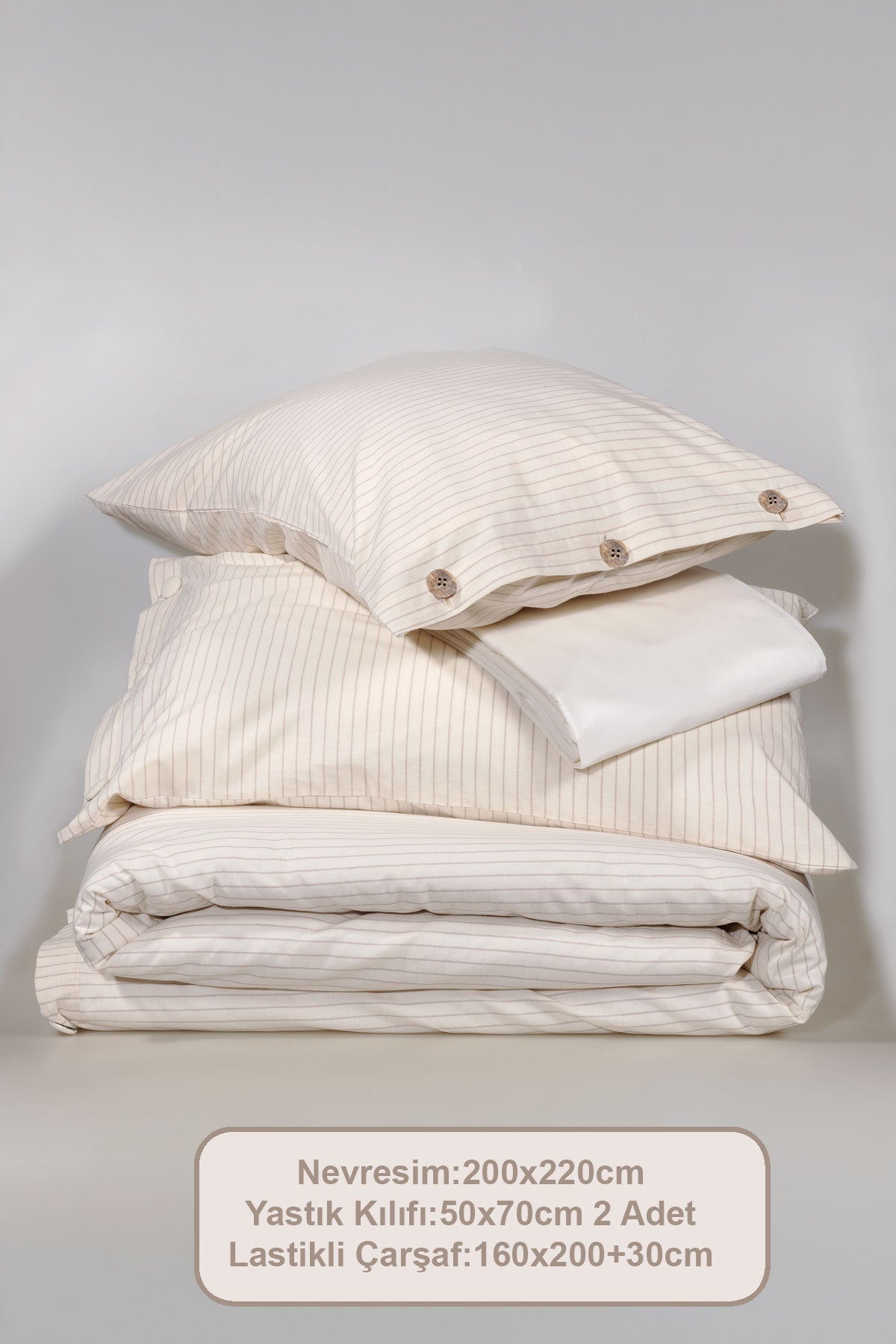 4 parçadan oluşmaktadır. Yıkama işlemi %100 pamuk kumaşa yumuşak bir doku kazandırarak her yıkamada bu hissi daha fazla hissedersiniz. Yıkanmış kumaş doğal hava geçirgen yapısı ve yüksek nem emici özelliği sayesinde terletmez. Rahat ve konforlu bir uyku deneyimi sunar. Cildi tahriş etmez ve insan sağlığına zarar vermez. Ahşap düğmenin natürel görünümü ve modern renk tonlarıyla evinizin dekorasyonuna kolayca uyum sağlayacaktır. 57 tel dokuma sıklığı ile bu takım uzun ömürlü ve dayanıklıdır. Ürünümüzü 30 derecede makinede yıkayarak günlük kullanımınızda konforu ve rahatlığı bulacaksınız. Kurutma makinesi ve kuru temizleme önerilmez.