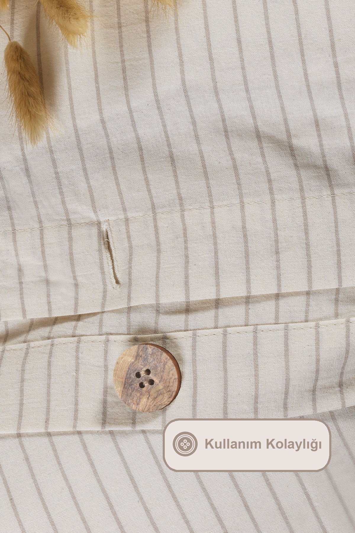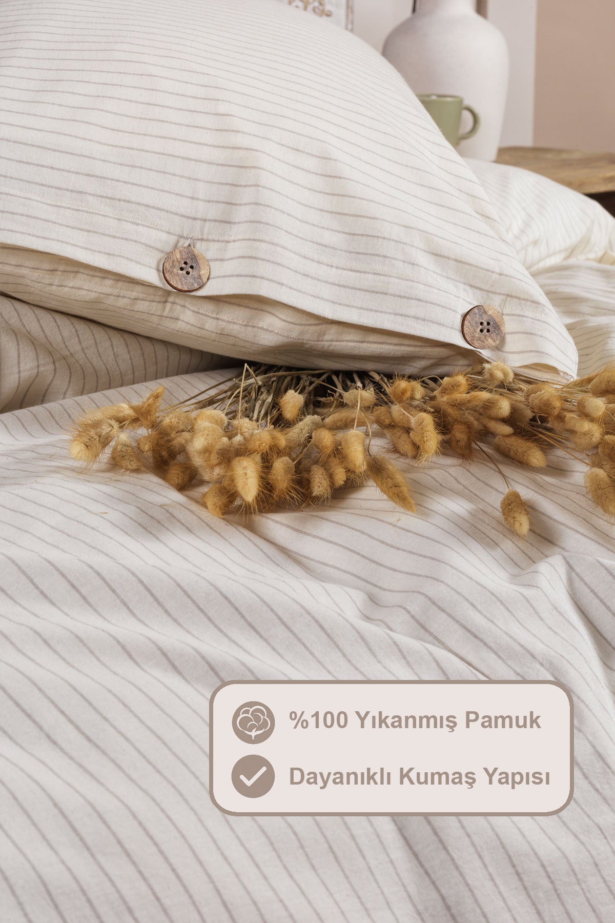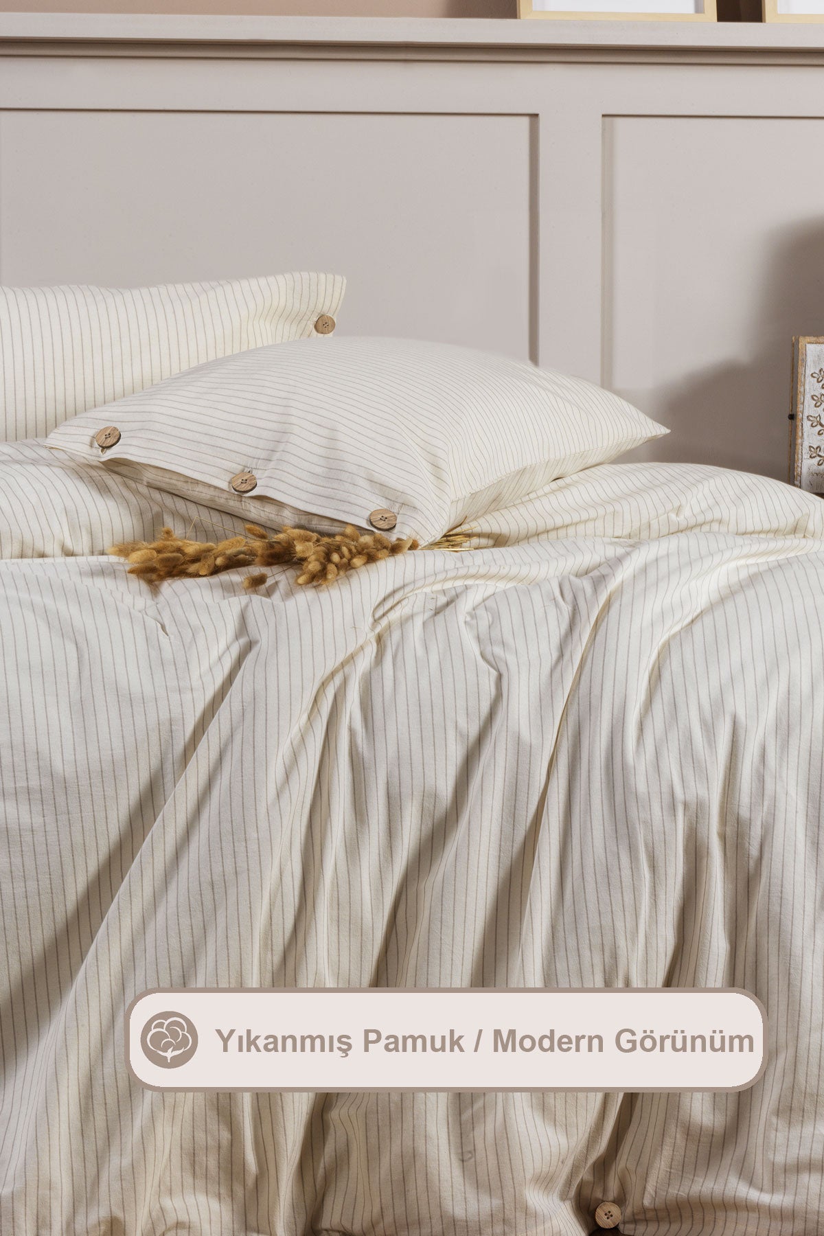 3 parçadan oluşmaktadır. Yıkama işlemi %100 pamuk kumaşa yumuşak bir doku kazandırarak her yıkamada bu hissi daha fazla hissedersiniz. Yıkanmış kumaş doğal hava geçirgen yapısı ve yüksek nem emici özelliği sayesinde terletmez. Rahat ve konforlu bir uyku deneyimi sunar. Cildi tahriş etmez ve insan sağlığına zarar vermez. Ahşap düğmenin natürel görünümü ve modern renk tonlarıyla evinizin dekorasyonuna kolayca uyum sağlayacaktır. 57 tel dokuma sıklığı ile bu takım uzun ömürlü ve dayanıklıdır. Ürünümüzü 30 derecede makinede yıkayarak günlük kullanımınızda konforu ve rahatlığı bulacaksınız. Kurutma makinesi ve kuru temizleme önerilmez.