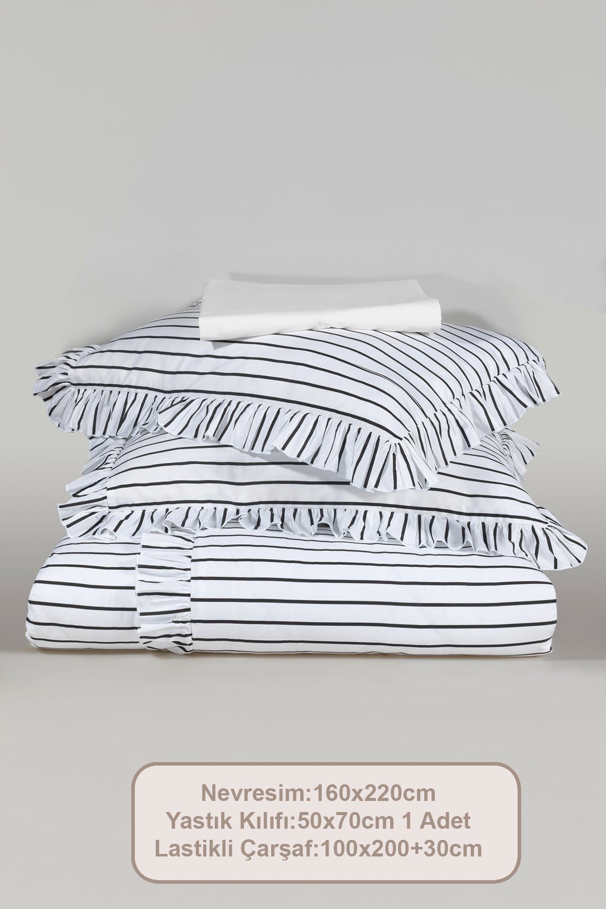 1 parçadan oluşmaktadır. %100 pamuk kumaş; doğal hava geçirgen yapısı ve yüksek nem emici özelliği sayesinde terletmez. Rahat ve konforlu bir uyku deneyimi sunar. Cildi tahriş etmez ve insan sağlığına zarar vermez. Fırfırların ve fashion renklerin romantik havası ile nevresim takımı farklı dekorasyon ve mevsim kullanımlarına uygundur. 54 tel dokuma sıklığı ile bu takım uzun ömürlü ve dayanıklıdır. Ürünümüzü 30 derecede makinede yıkayarak günlük kullanımınızda konforu ve rahatlığı bulacaksınız. Kurutma makinesi ve kuru temizleme önerilmez.