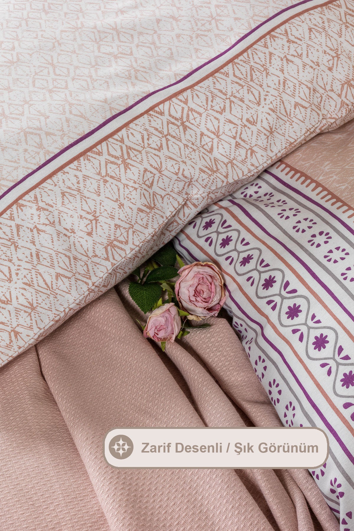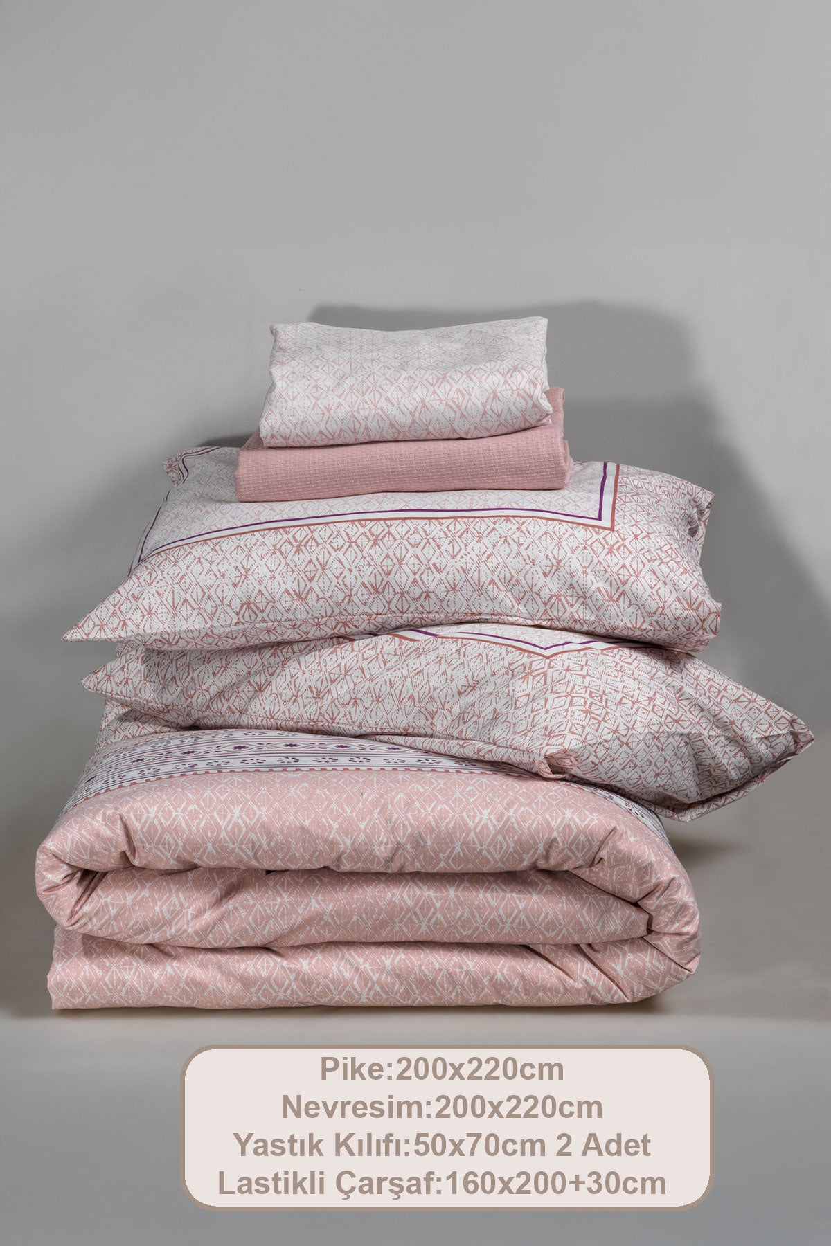 5 parçadan oluşmaktadır. Kış mevsiminde pamuklu nevresimi yorgan geçirerek kullanırken, yaz mevsiminde ise %100 pamuk pikesini kullanabilirsiniz. Pamuklu kumaş; doğal hava geçirgen yapısıyla rahat ve konforlu bir uyku deneyimi sunar. Canlı renkleri ve modern deseni ile yatak odalarınıza ferah ve şık bir görünüm sağlar. Kolay ütülenebilir yapısıyla kullanım kolaylığı sağlar. Ürünümüzü 30 derecede makinede yıkayarak ilk günkü parlaklığını kaybetmeden kullanabilirsiniz. Kurutma makinasında düşük ısıda kurutma yapılabilir.