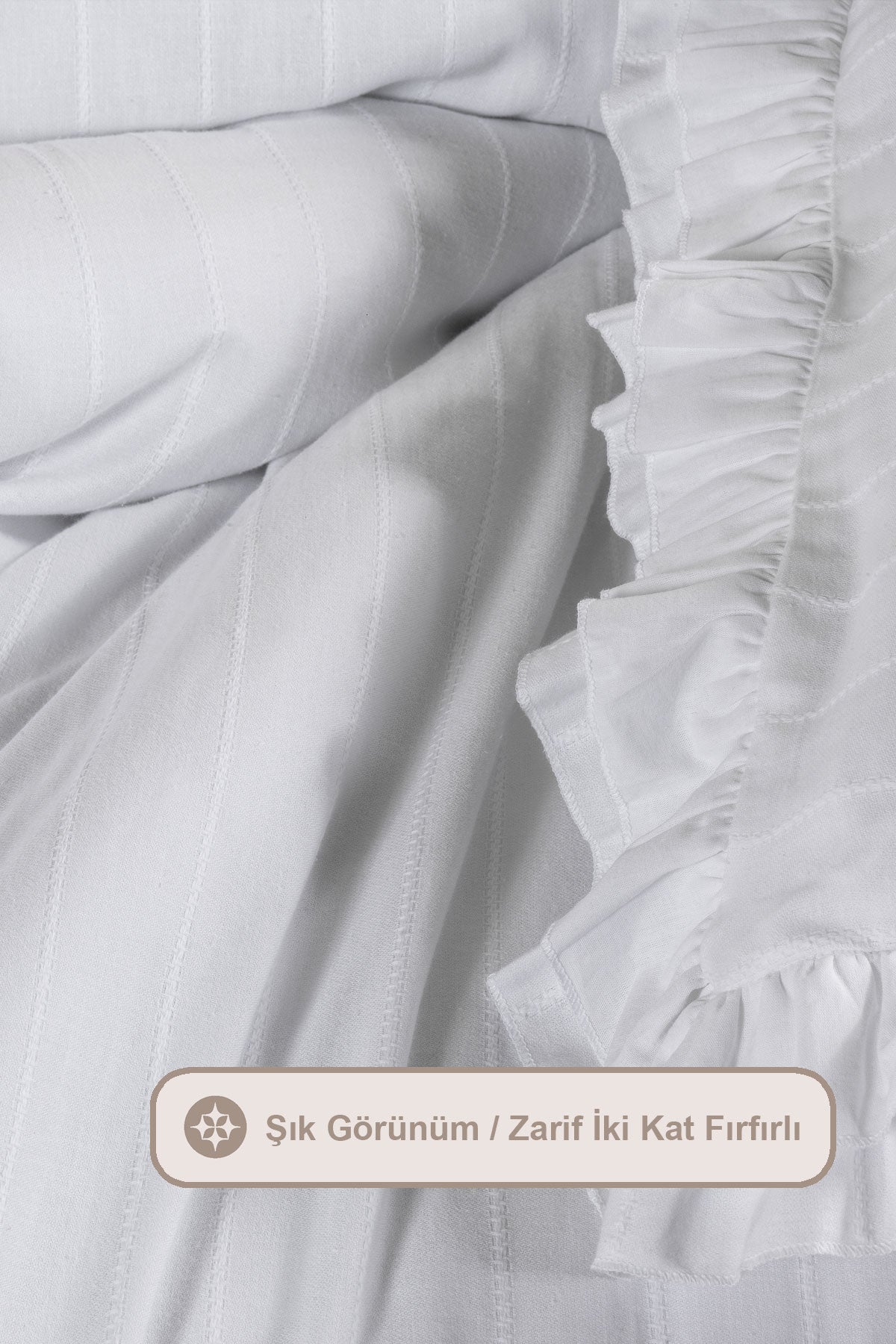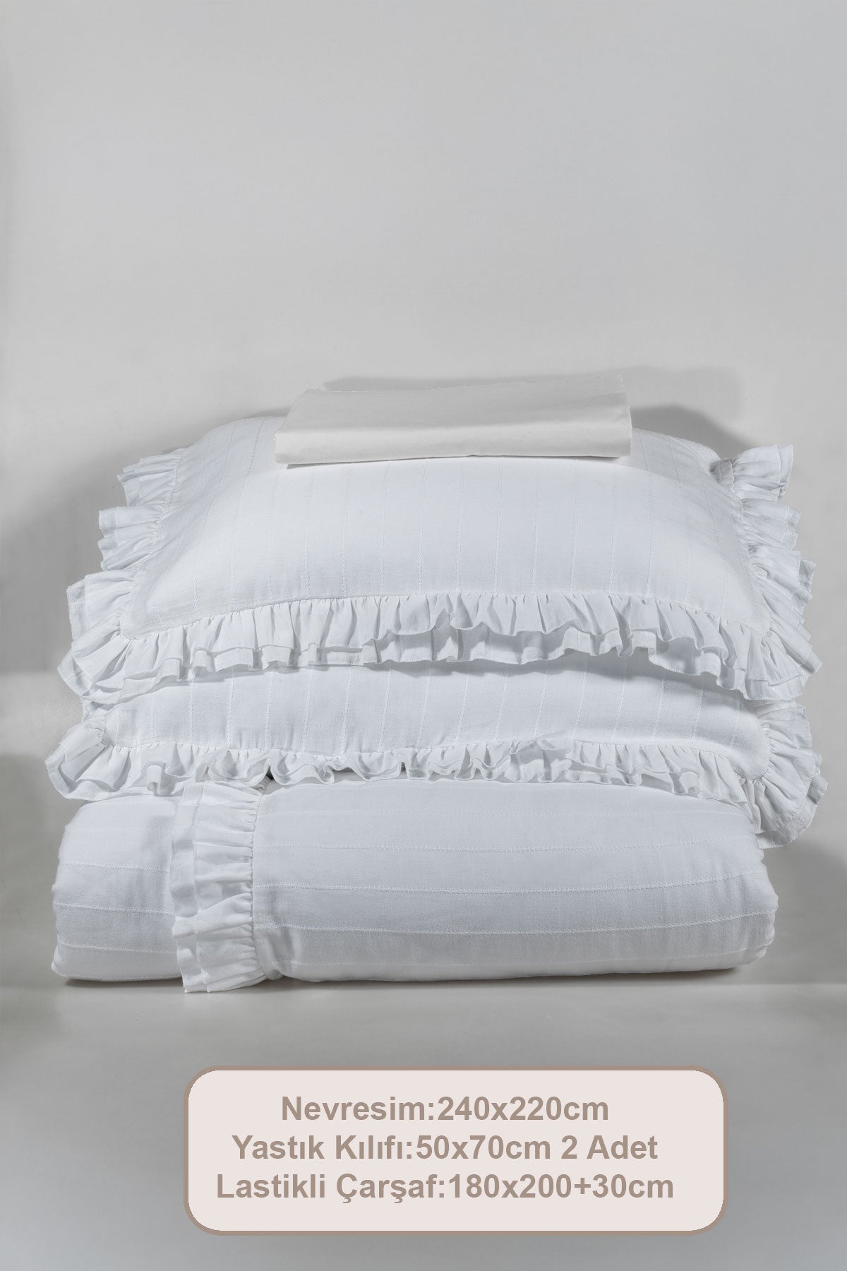 4 parçadan oluşmaktadır. 240x220 cm battal ölçüsündeki nevresim takımı, geniş yapısıyla çift kişilik yataklara mükemmel uyum sağlayarak, yorgan kavgalarına son verir. %100 pamuk kumaş; doğal hava geçirgen yapısı ve yüksek nem emici özelliği sayesinde terletmez. Rahat ve konforlu bir uyku deneyimi sunar. Cildi tahriş etmez ve insan sağlığına zarar vermez. Çift kat fırfırların ve soft renklerin romantik havası ile nevresim takımı farklı dekorasyon ve mevsim kullanımlarına uygundur. 54 tel dokuma sıklığı ile bu takım uzun ömürlü ve dayanıklıdır. Ürünümüzü 30 derecede makinede yıkayarak günlük kullanımınızda konforu ve rahatlığı bulacaksınız. Kurutma makinesi ve kuru temizleme önerilmez.