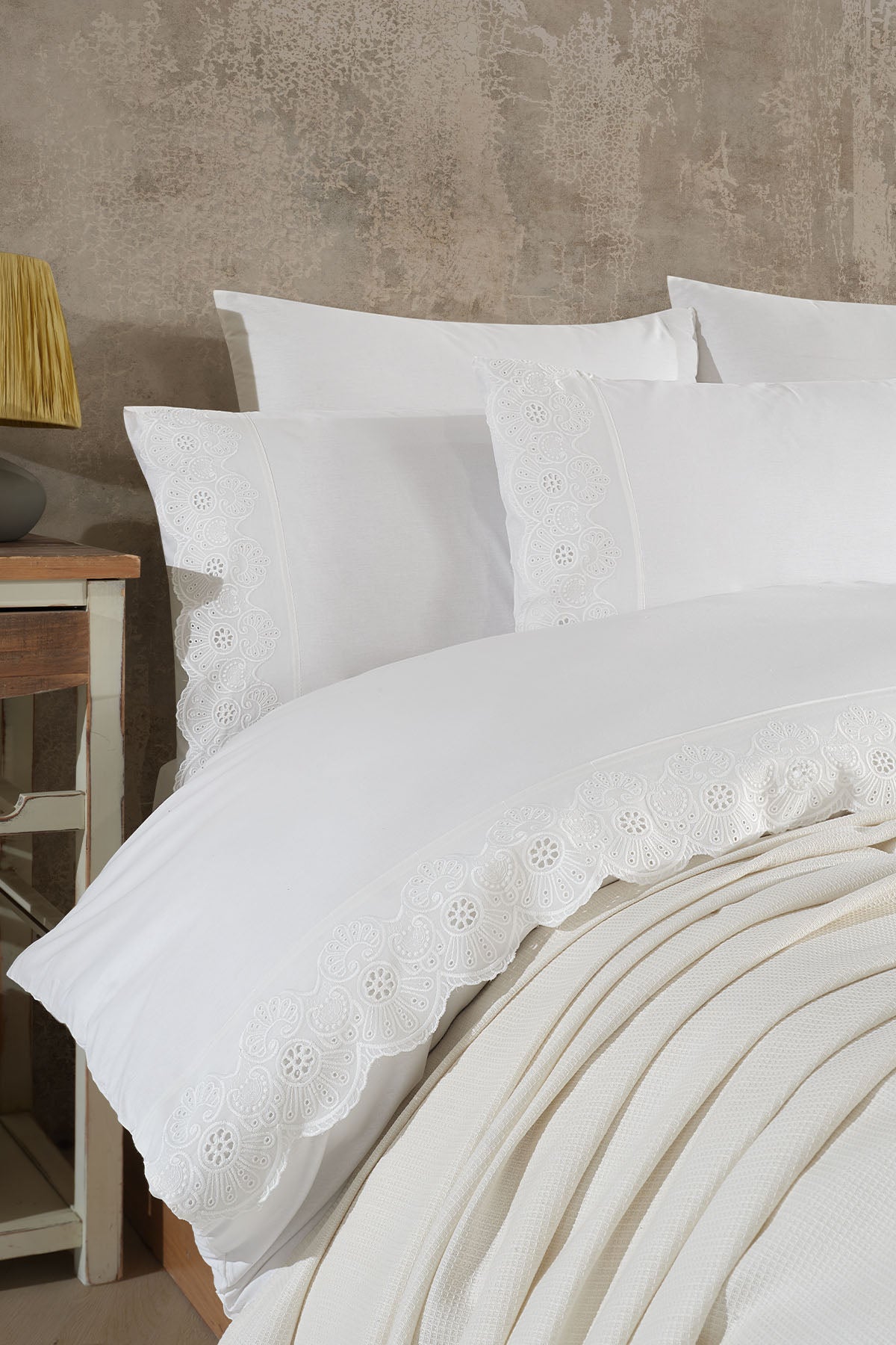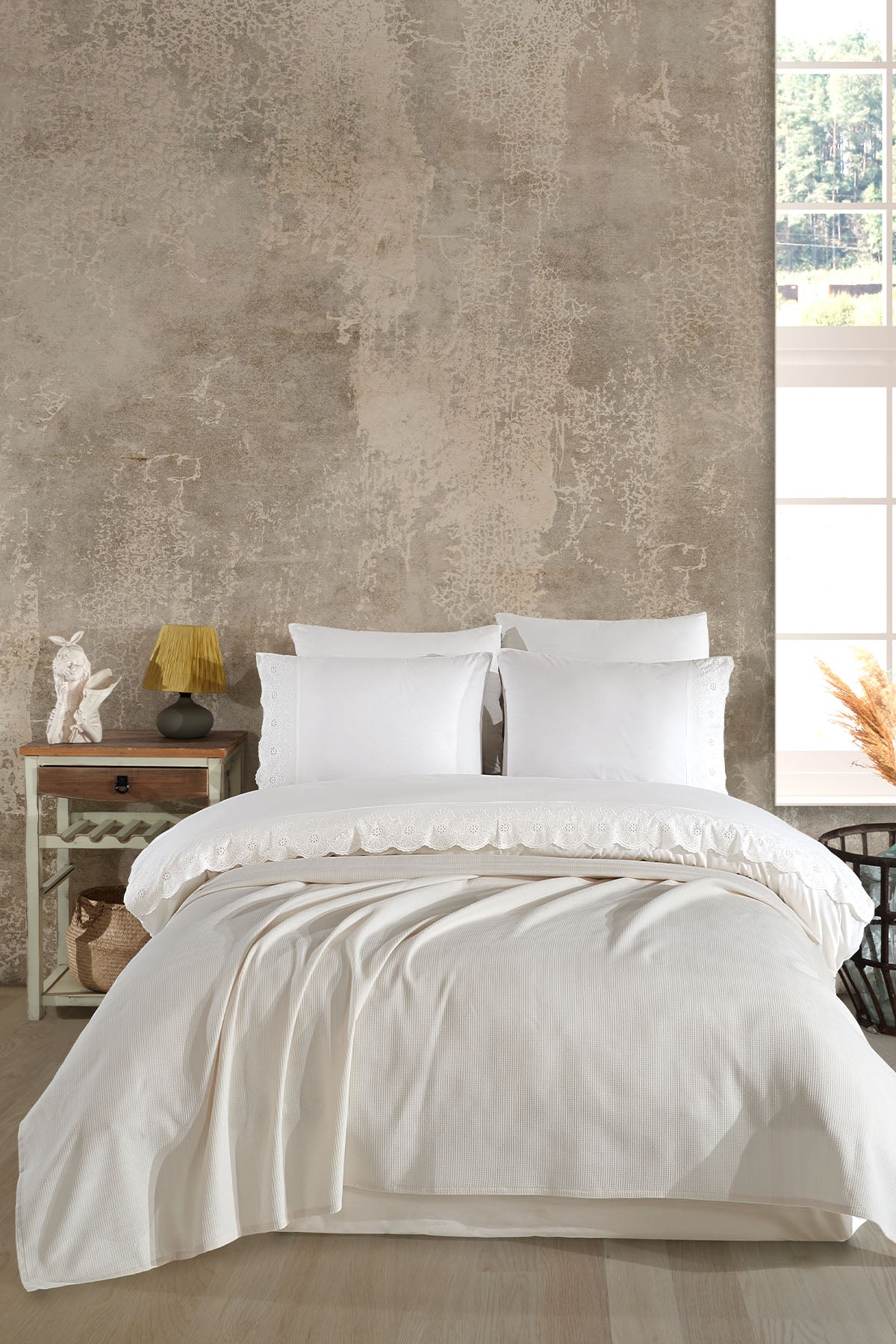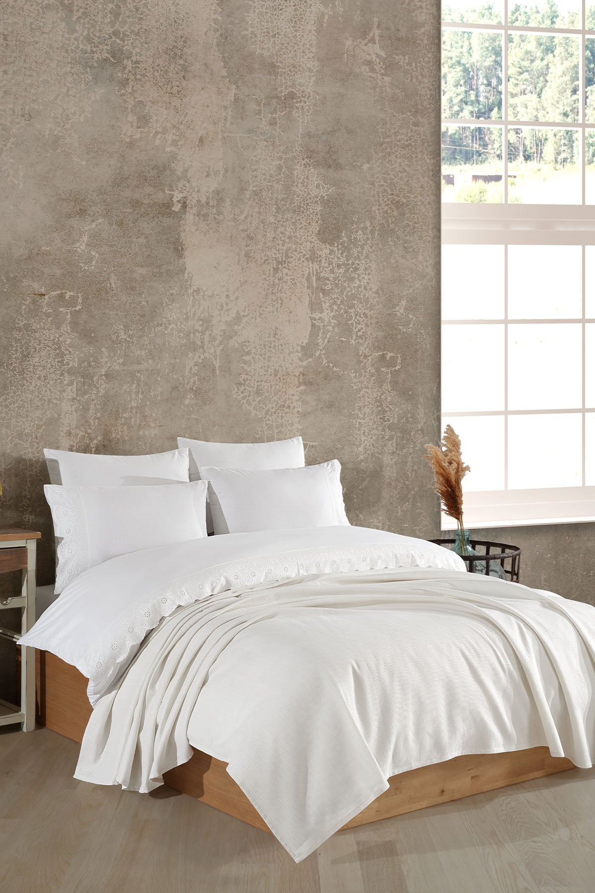 Miras Nevresimli Pike Takımı, hem işlevsel hem de estetik arayanlar için özel olarak tasarlandı. 5 parça yastık kılıfı, brodeli nevresim ve geniş ebatlı pike ile zenginleştirilmiş bu set; yaz aylarında ferah bir kullanım, kış aylarında ise dekoratif bir görünüm sunar.