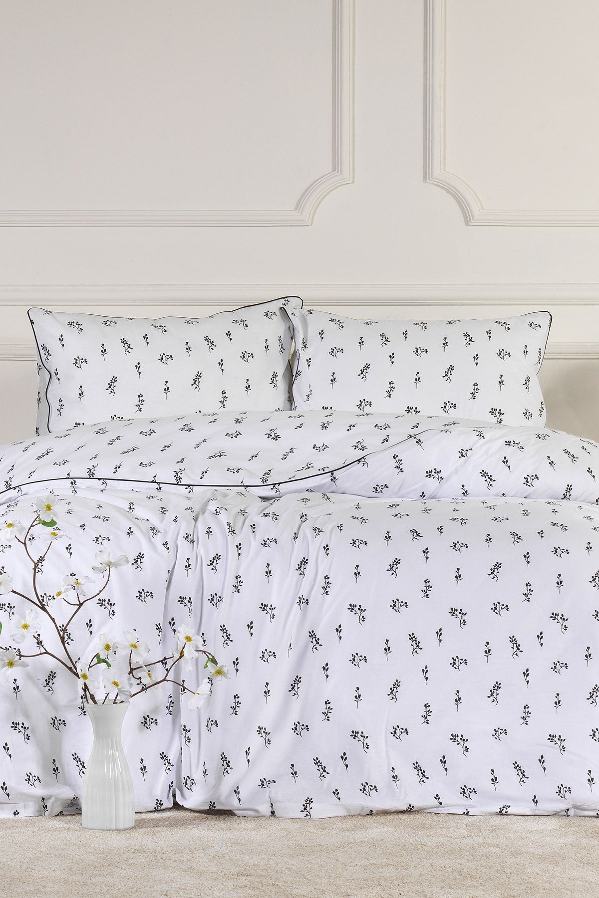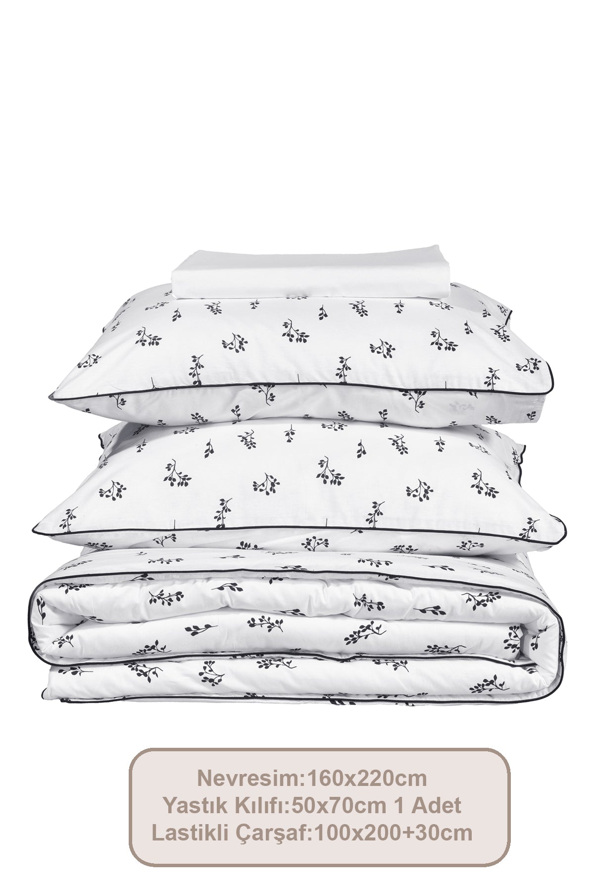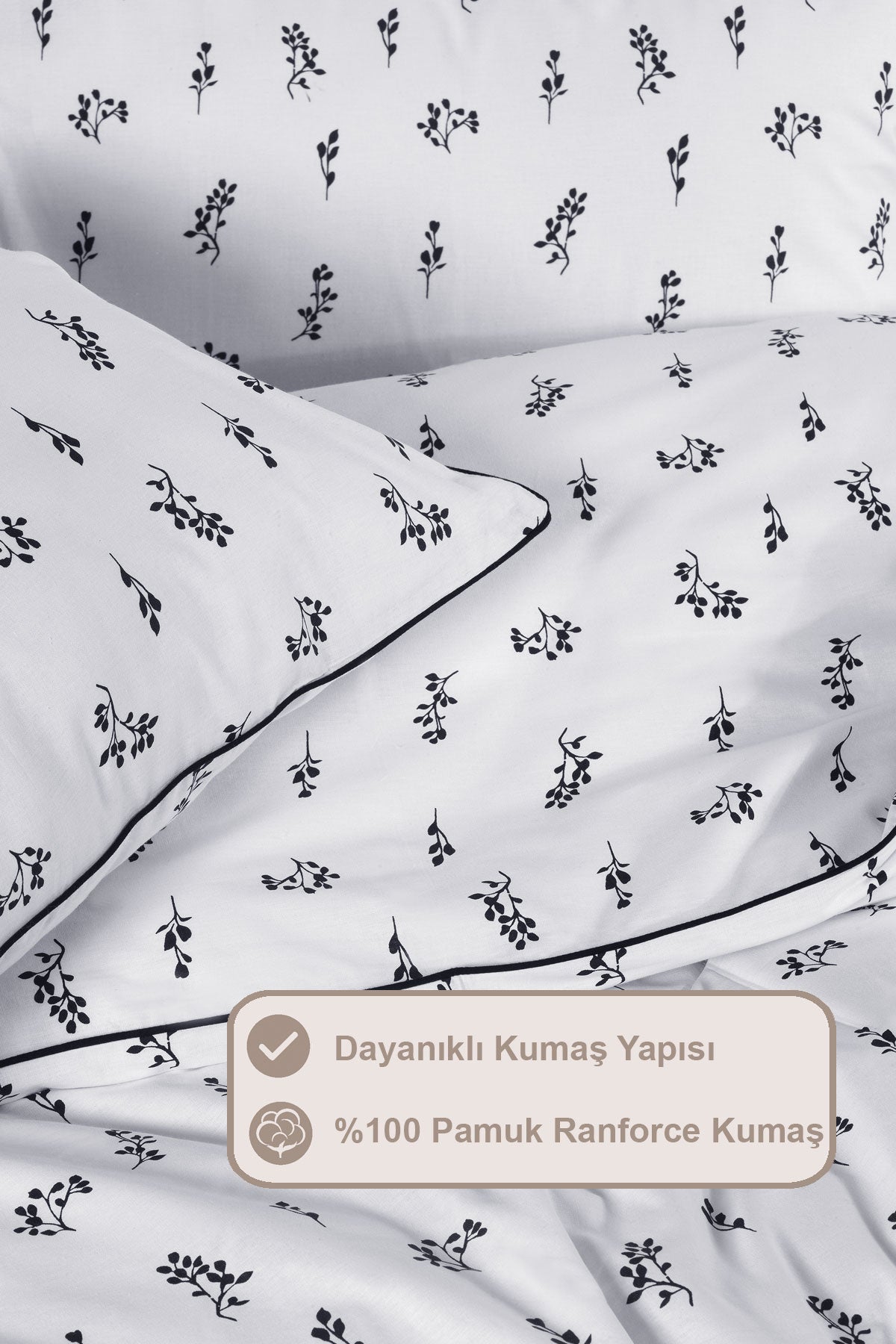 3 parçadan oluşmaktadır. %100 pamuk kumaş; doğal hava geçirgen yapısı ve yüksek nem emici özelliği sayesinde terletmez. Rahat ve konforlu bir uyku deneyimi sunar. Cildi tahriş etmez ve insan sağlığına zarar vermez. Biyenin tamamlayıcı görüntüsü ve zamansız siyah beyaz renk harmonisi ile nevresim takımı farklı dekorasyon ve mevsim kullanımlarına uygundur. 54 tel dokuma sıklığı ile bu takım uzun ömürlü ve dayanıklıdır. Ürünümüzü 30 derecede makinede yıkayarak günlük kullanımınızda konforu ve rahatlığı bulacaksınız. Kurutma makinesi ve kuru temizleme önerilmez.