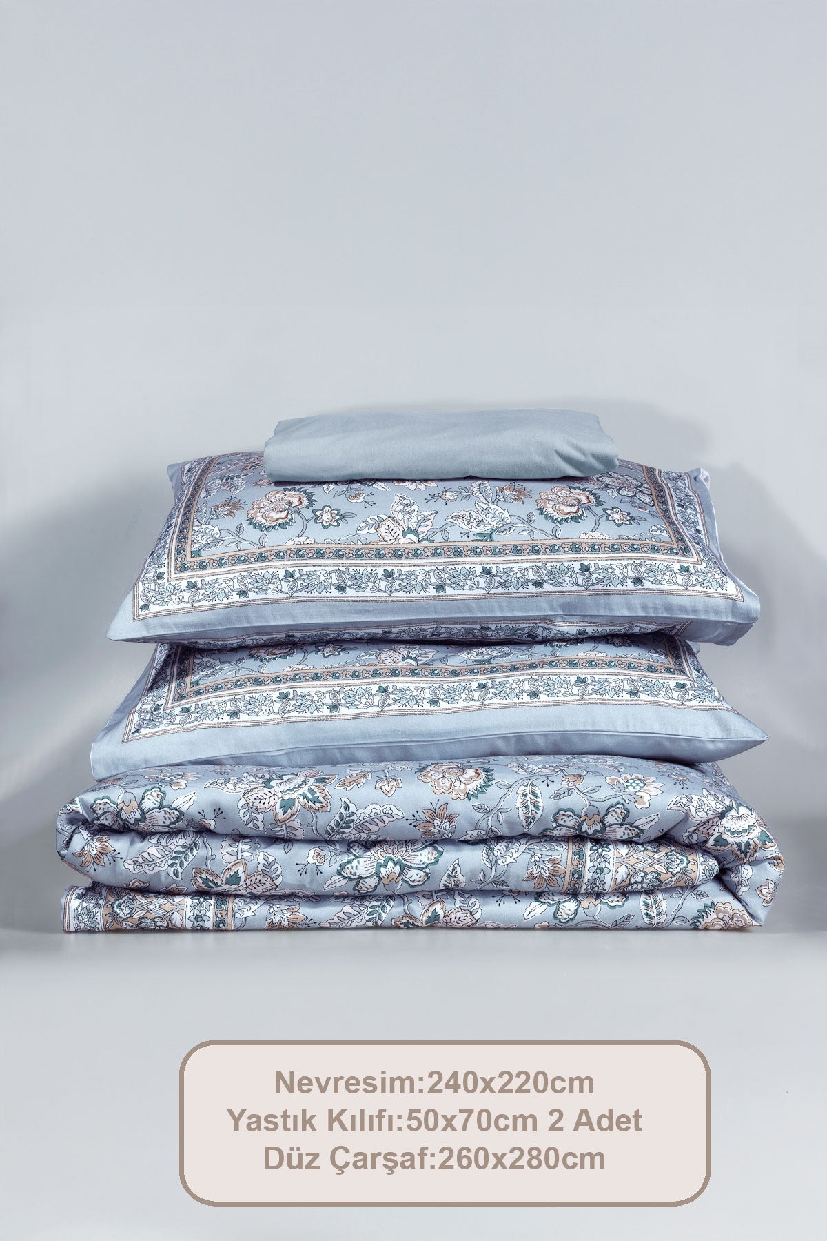 4 parçadan oluşmaktadır. 240x220 cm battal ölçüsündeki nevresim takımı, geniş yapısıyla çift kişilik yataklara mükemmel uyum sağlayarak, yorgan kavgalarına son verir. Parlak satenin zarif dokusu, dijital baskının canlı ve net renkleriyle buluşuyor. Modern teknolojiyle üretilen özel baskılar, her detayda renklerin ışıltısını korurken, %100 pamuk saten dokusu cildinize yumuşak bir temas sunar. Doğal hava geçirgen yapısı ve yüksek nem emici özelliği sayesinde terletmez. Rahat ve konforlu bir uyku deneyimi sunar. Cildi tahriş etmez ve insan sağlığına zarar vermez. Göz alıcı tasarımıyla yatak odanıza estetik bir hava katarak konforlu uykunun keyfini yaşatır. 82 tel dokuma sıklığı ile bu takım uzun ömürlü ve dayanıklıdır. Ürünümüzü 30 derecede makinede yıkayarak günlük kullanımınızda konforu ve rahatlığı bulacaksınız. Kurutma makinesi ve kuru temizleme önerilmez.