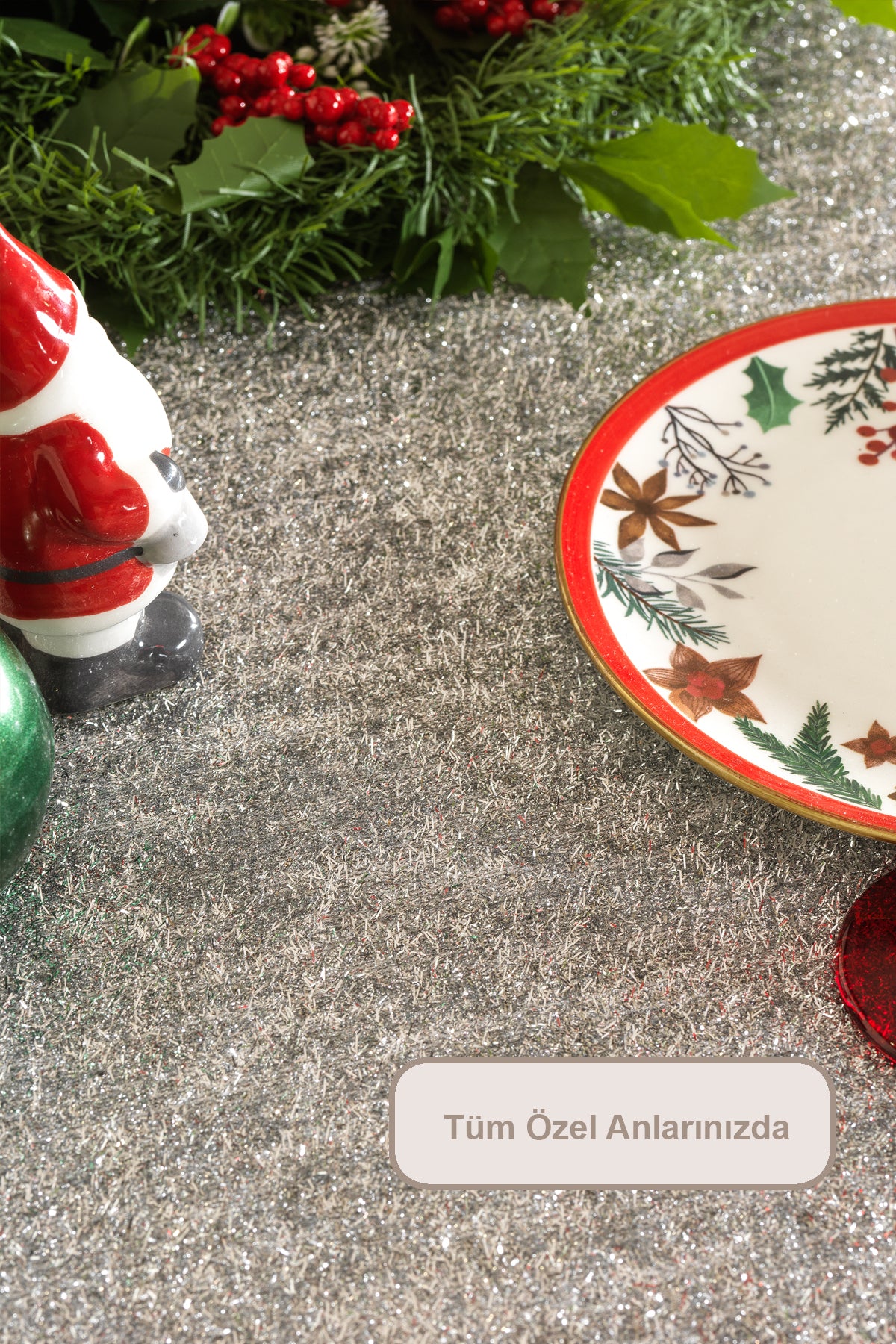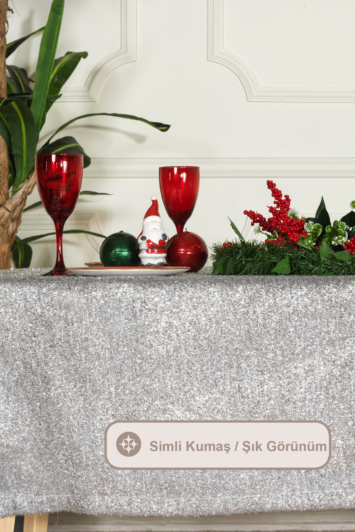 1 parçadan oluşmaktadır. Zarif ışıltılı simlerle bezenmiş dokuma kumaş masa örtüsü şık görünümü ile nişan, söz, doğum günü gibi özel günlerinizde masa dekorasyonunuzu şıklığıyla tamamlayacaktır. Sofralarınıza zarif bir dokunuş katacaktır. Dayanıklı ve kolay temizlenen yapısıyla masa örtünüzü düşük devirde hassas programda yıkayarak ilk günkü formunu koruyabilirsiniz. Kurutma makinesi ve kuru temizleme önerilmez.