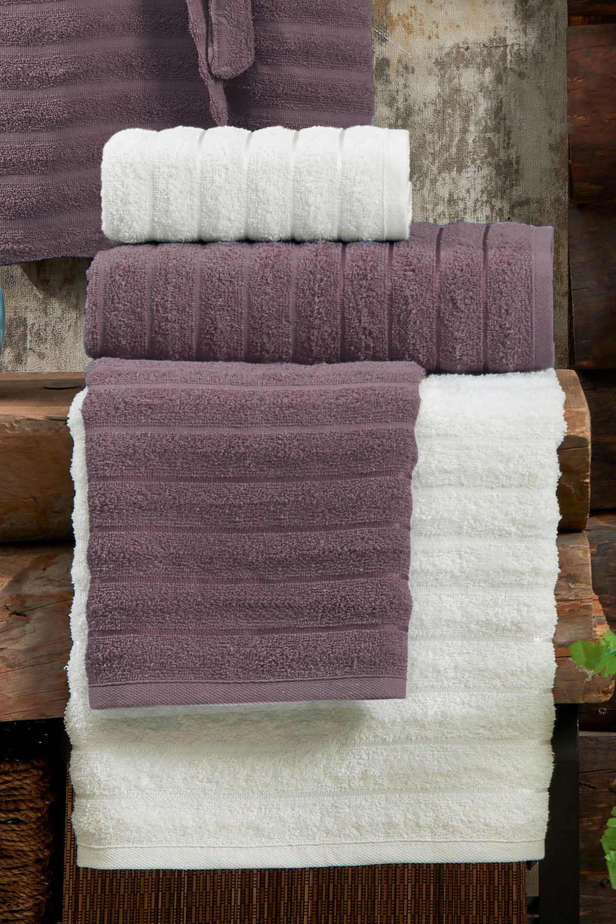 ELART Soft Bornoz Aile Seti 6 Parça (70x135 cm) Mürdüm - Krem