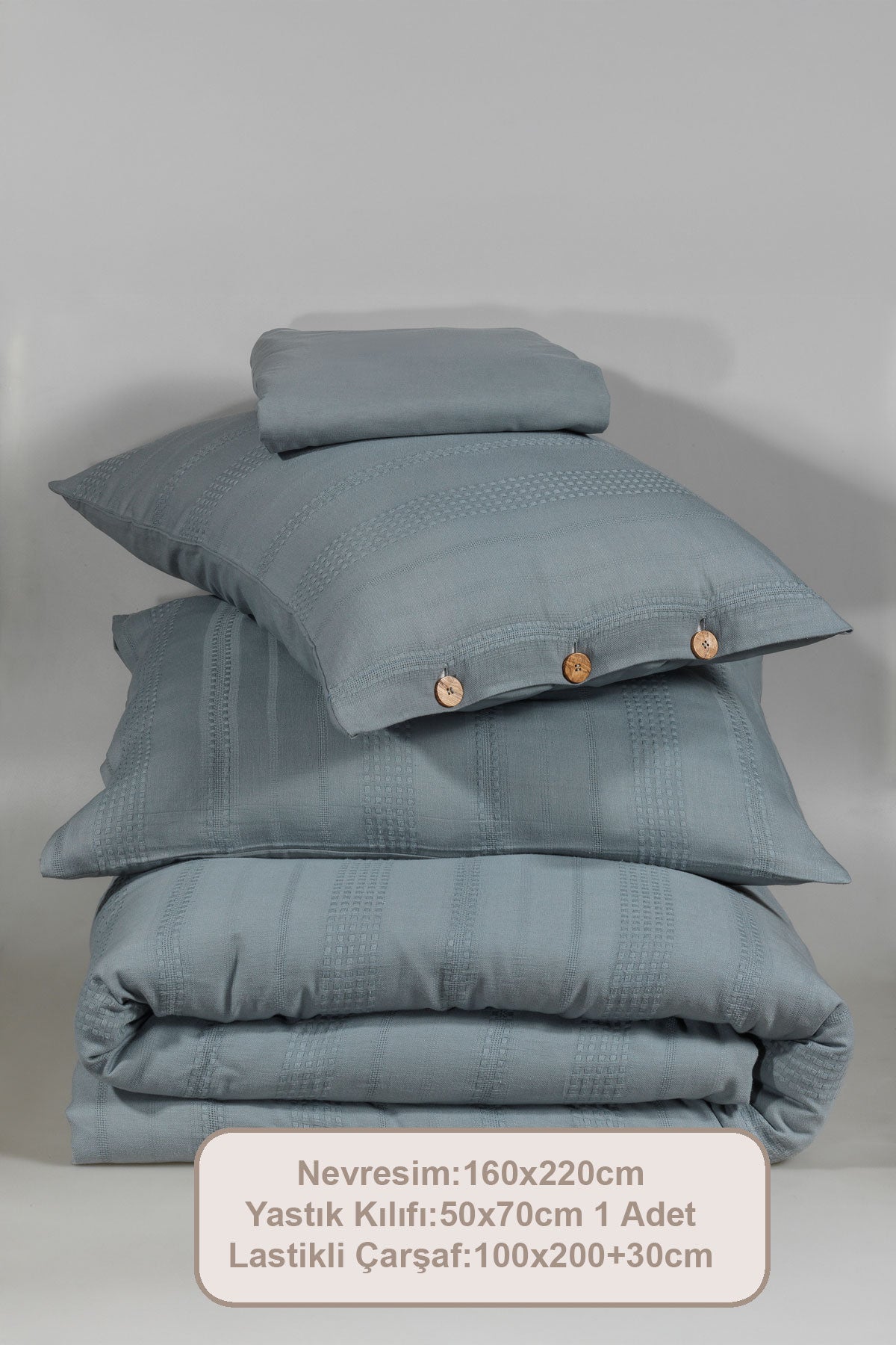 3 parçadan oluşmaktadır. %100 pamuk kumaş; doğal hava geçirgen yapısı ve yüksek nem emici özelliği sayesinde terletmez. Rahat ve konforlu bir uyku deneyimi sunar. Cildi tahriş etmez ve insan sağlığına zarar vermez. Ahşap düğmenin natürel görünümü ve modern soft renk tonlarıyla evinizin dekorasyonuna kolayca uyum sağlayacaktır. 54 tel dokuma sıklığı ile bu takım uzun ömürlü ve dayanıklıdır. Ürünümüzü 30 derecede makinede yıkayarak günlük kullanımınızda konforu ve rahatlığı bulacaksınız. Kurutma makinesi ve kuru temizleme önerilmez.