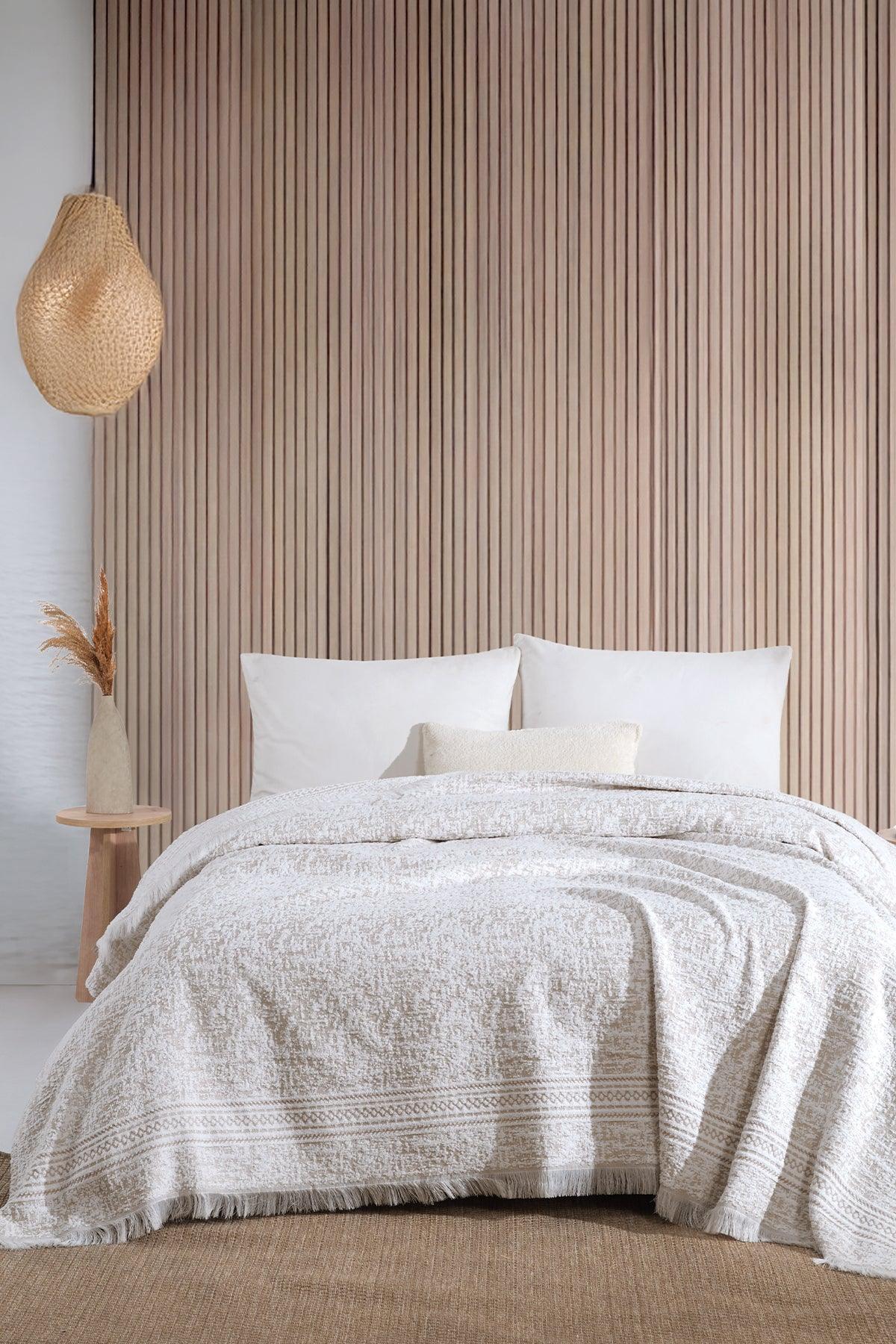 Pamuksu dokusuyla hem yatak örtüsü hem de battaniye olarak kullanılabilir;