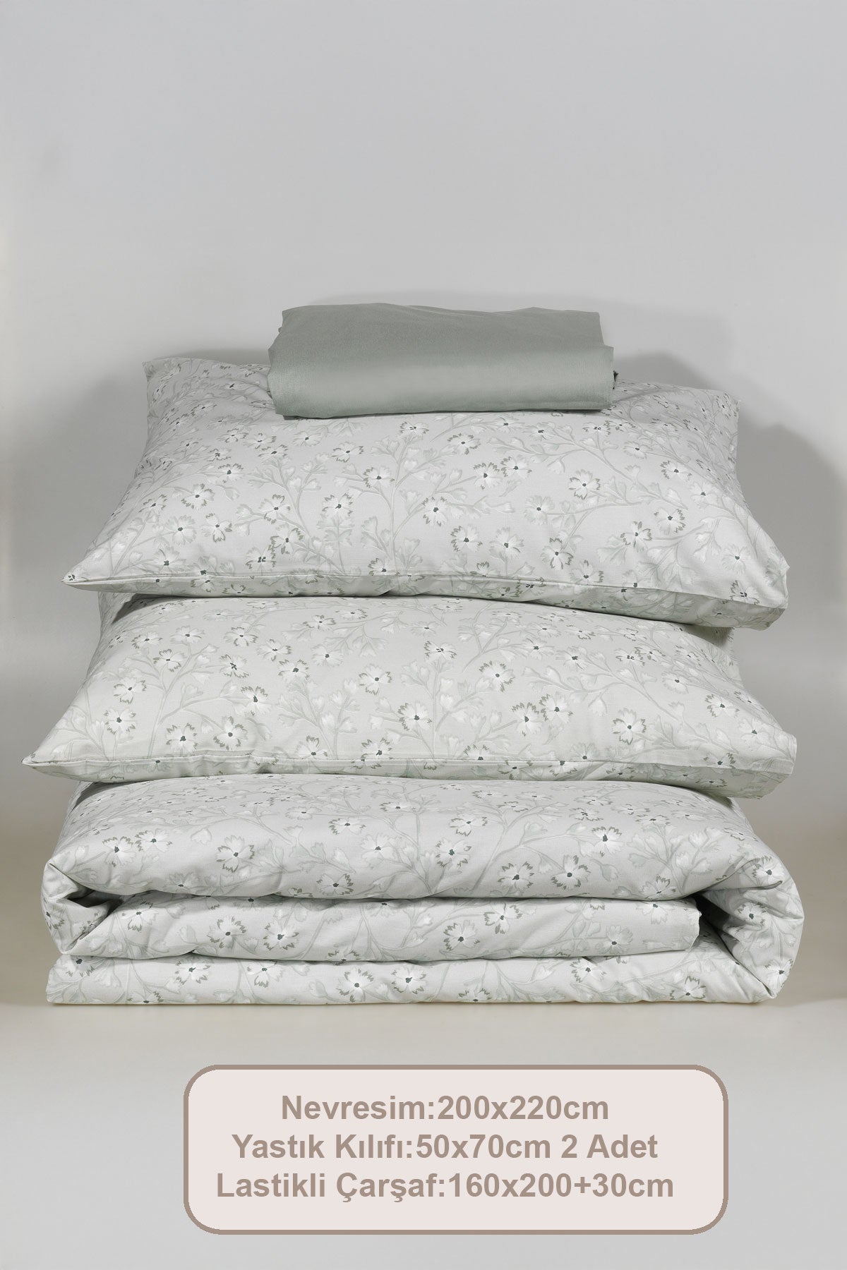Nevresim: %100 pamuk kumaş; doğal hava geçirgen yapısı ve yüksek nem emici özelliği sayesinde terletmez. Rahat ve konforlu bir uyku deneyimi sunar. Cildi tahriş etmez ve insan sağlığına zarar vermez. 54 tel dokuma sıklığı ile ranforce kumaş uzun ömürlü ve dayanıklıdır.