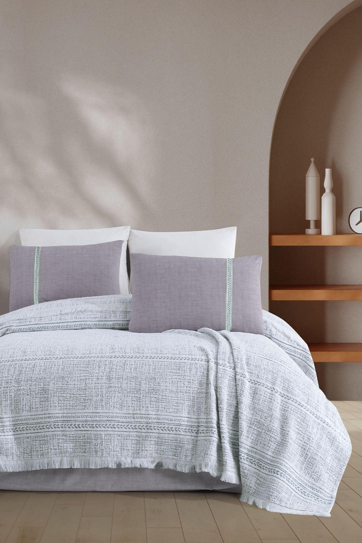 Pamuksu dokusuyla hem yatak örtüsü hem de battaniye olarak kullanılabilir;