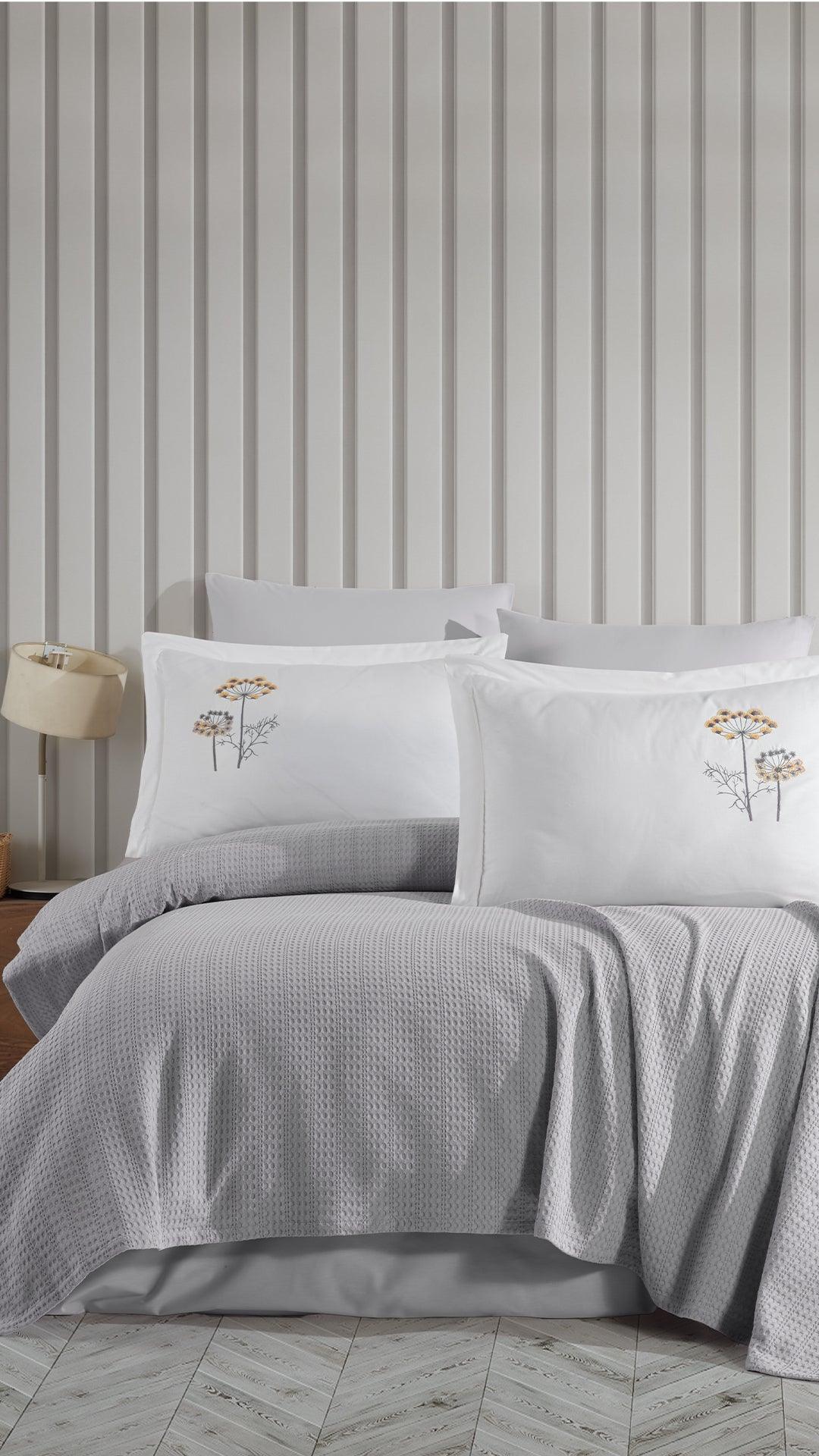 Nakışlı yastık kılıfları, pike ile mükemmel uyum sağlayarak şık bir görünüm oluşturur ;