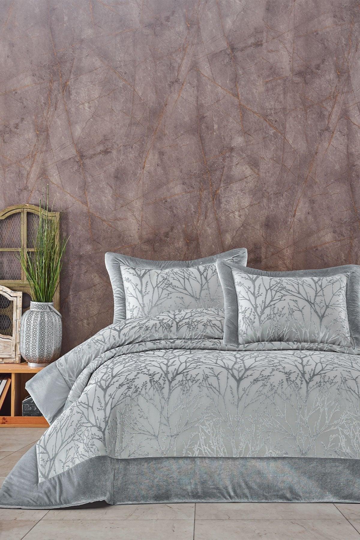 ELART Bahar Yatak Örtüsü Takımı Çift Kişilik Elyaf Dolgulu Pano Kadife Gümüş
